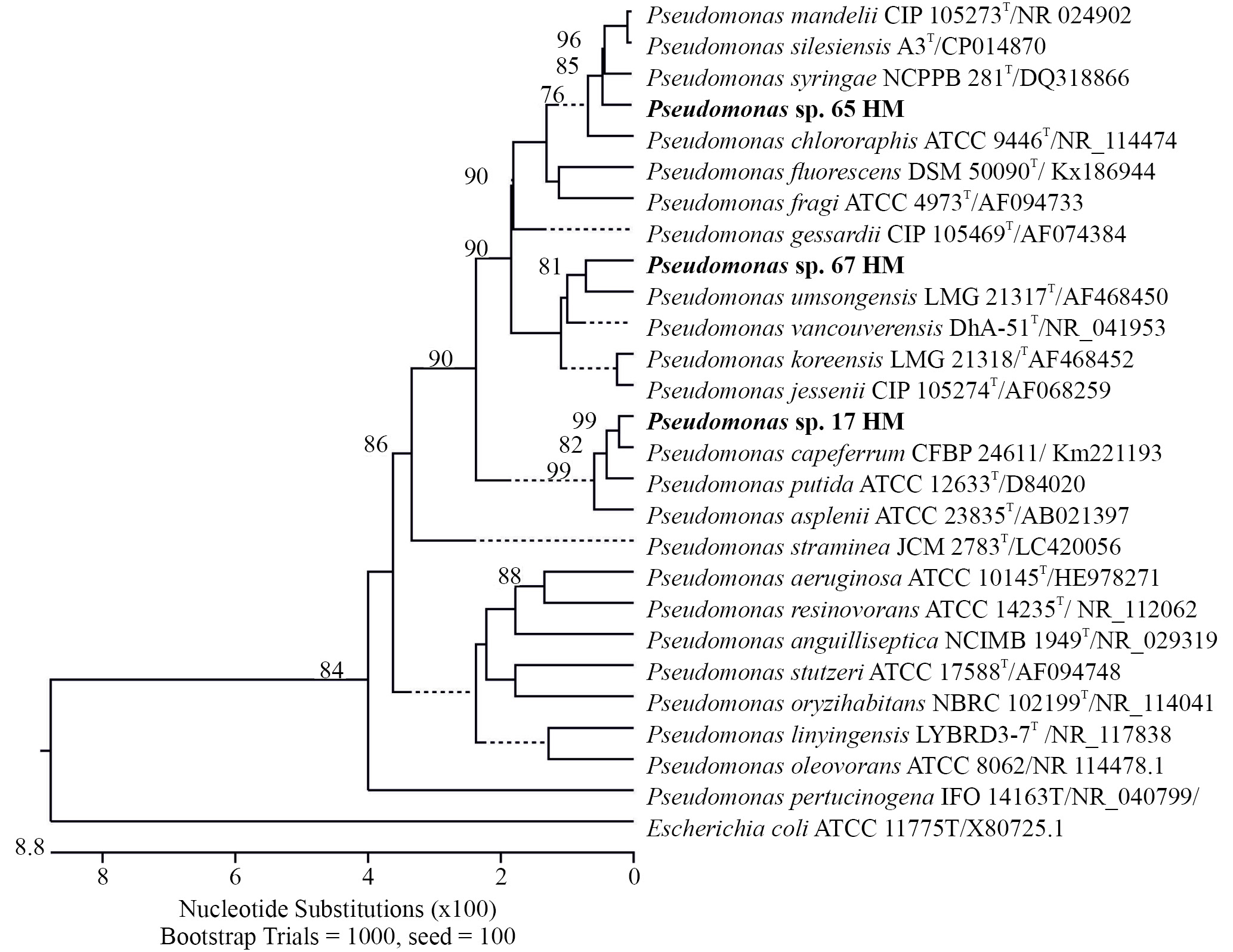 По ранее полученным данным сравнительного анализа генов 16S рРНК и rpoD род Pseudomonas можно разделить на три основные группы: Pseudomonas aeruginosa, Pseudomonas pertucinogena и Pseudomonas fluorescens (Lalucat et al., 2020; Girard et al., 2020). Секвенирование вышеуказанных генов выявило, что штаммы Pseudomonas sp. 17 HM, 65 HM и 67 HM с большой вероятностью можно отнести к видам P. capeferrum, P. silesiensis, P. umsongensis, соответственно, которые входят в группу P. fluorescens. Сообщалось, что представители данных видов в большинстве случаев были выделены из почв и многие из них обладали свойствами PGPR бактерий, а также способностью к биоаккумуляции и биодеградации загрязняющих веществ (Berendsen et al., 2015; Kaminski et al., 2018; Narancic et al., 2021).