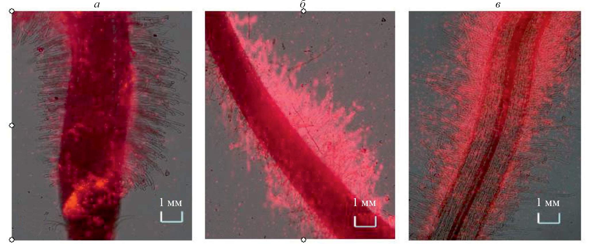 Рис. 4. Образование биопленок на поверхности корней проростков люцерны через 24 ч совместного культивирования: а – Pseudomonas sp. 17 HM; б – Pseudomonas sp. 65 HM; в – Pseudomonas sp. 67 HM.
