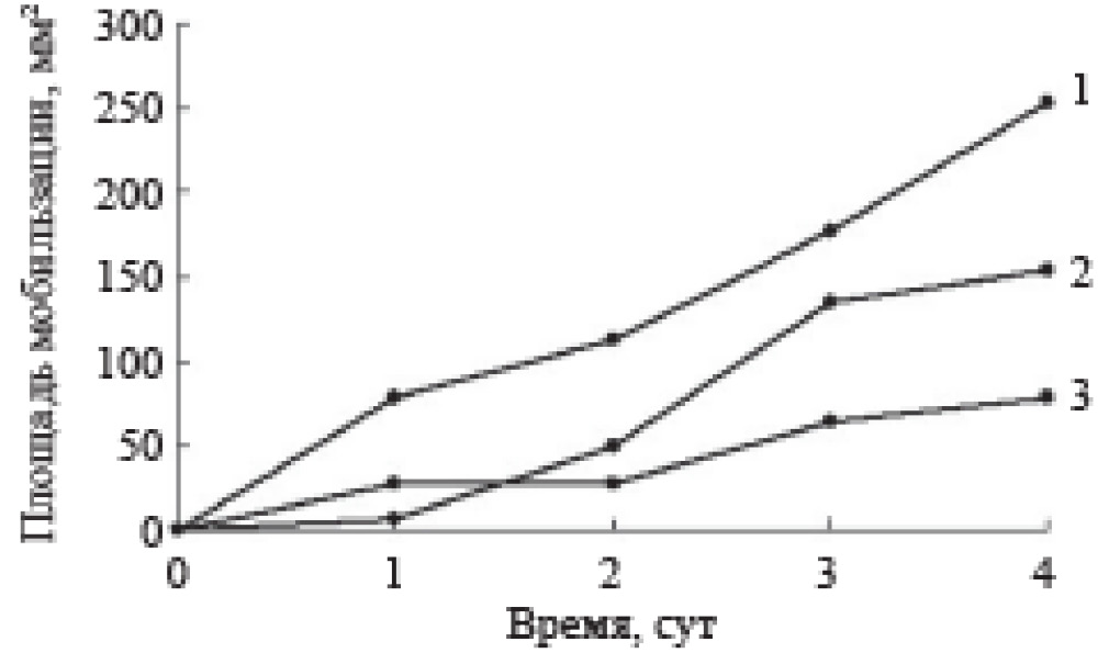 Рис. 5. Динамика мобилизации неорганического фосфата штаммами Pseudomonas sp.: 1 – 17 HM; 2 – 67 HM; 3 – 65 HM. По оси абсцисс ‒ сутки, на которые измеряли площадь мобилизации фосфата; по оси ординат ‒ значения площади зон мобилизации фосфата в мм².