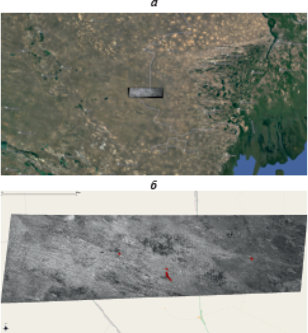 Рис. 1. Модельный участок территории Северо-Западного Прикаспия, покрытая спутниковым изображением № 1 (а), и само спутниковое изображение № 1, использованное для обучения нейронных сетей, с указанием местоположения выявленных экспертом-зоологом сайгаков (б).