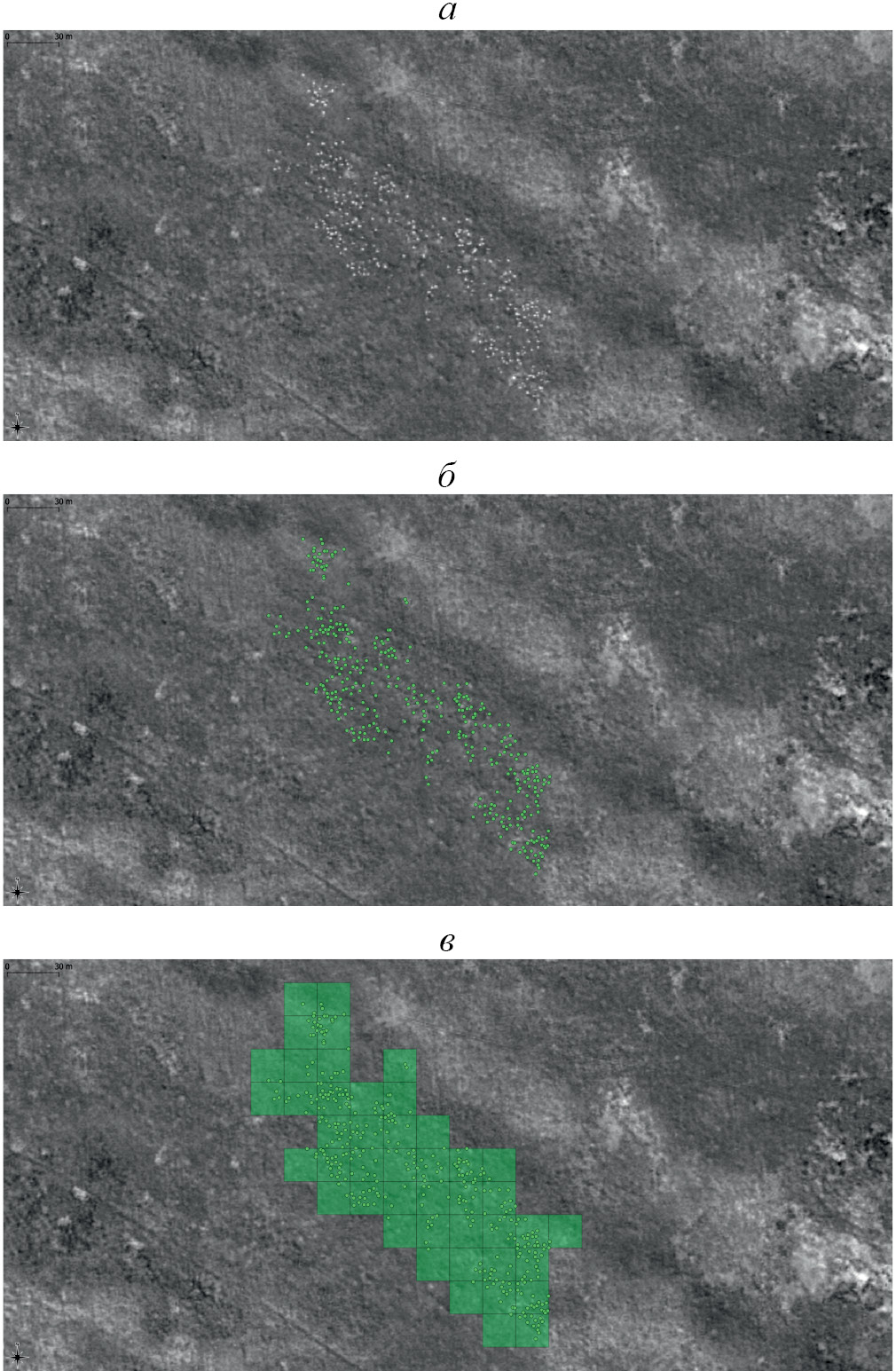 Рис. 4. Часть спутникового снимка №1 с изображением стада сайгаков (а); сайгаки, выявленные экспертом-зоологом в ручном режиме (б); ИП фрагменты снимка, выявленные нейронной сетью (в).