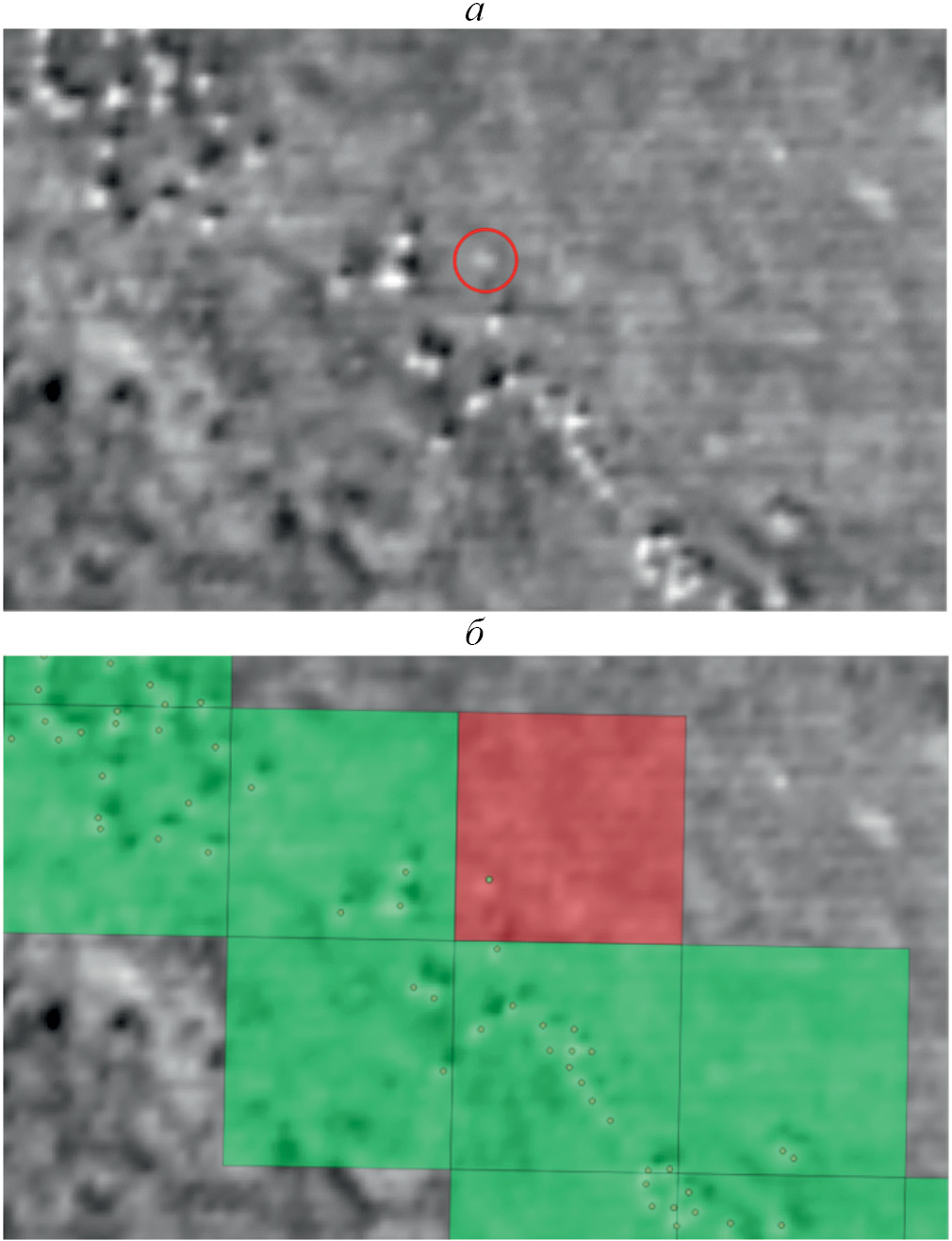 Рис. 5. Пример ложного отрицательного выявления: на спутниковом изображении №1 — обведен красной линией (а), после обработки спутникового изображения — в красном квадрате (б); выявленный экспертом-зоологом объект отличается от изображения сайгака, и, вероятно, не является животным.