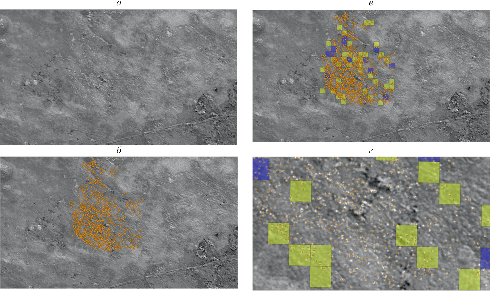 Рис. 6. Пример ложных положительных выявлений; выявлено изображение стада неизвестных животных (а, б); фрагменты ЛП (уверенность 100% — синие квадраты, уверенность от 70 до 99% — желтые квадраты) покрывают лишь разрозненные участки, на которых плотность животных сопоставима с плотностью сайгаков в стаде (в, г).