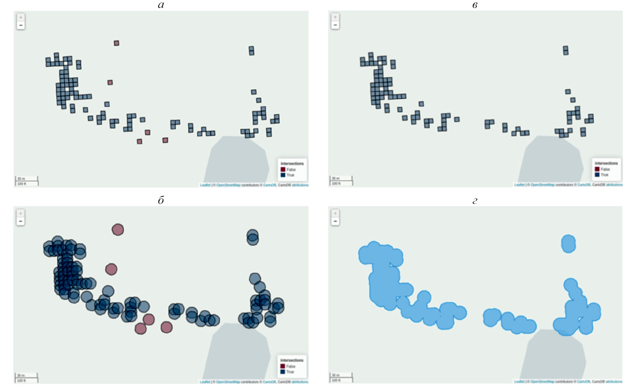 Рис. 8. Пример фильтрации результатов функционирования ГКНС-К: а — первичное выделение изолированных фрагментов (фиолетовый цвет); б — построение буферов вокруг всех фрагментов и окончательное выявление изолированных фрагментов; в — фильтрация изолированных фрагментов; г — формирование территориальных зон для дальнейшей обработки.