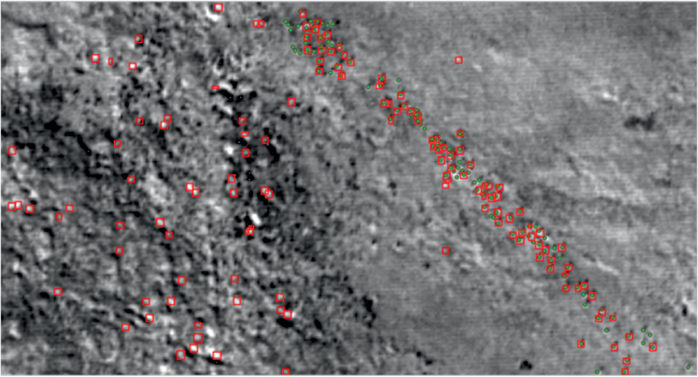 Рис. 10. Часть спутникового снимка №1, не прошедшего обработку с помощью ГКНС-К, с изображениями сайгаков, выявленными экспертом-зоологом (зеленые точки), и объектами, выявленными нейронной сетью ГКНС-В (красные рамки) — выявлено большое количество ложных объектов вдали от стада сайгаков.
