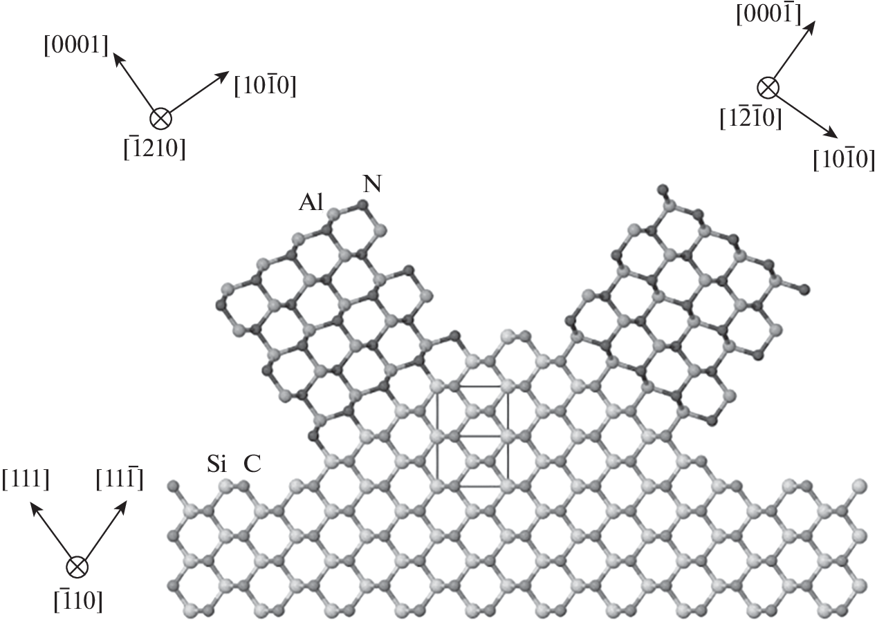 В работе на примере роста нитрида алюминия (AlN) на кремнии (Si) ориентации (110) с буферным слоем карбида кремния (SiC) разработан метод выращивания нового типа подложек, позволяющий получать механически ненапряженные полупроводниковые гетероструктуры. Особенность синтеза данного рода подложек заключается в том, что используемые для роста пленок AlN слои SiC синтезированы методом согласованного замещения атомов. При использовании данного метода роста в подложке Si происходит замещение части атомов Si на атомы углерода. В результате замещения атомов первоначально гладкая поверхность Si(110) превращается в поверхность SiC, покрытую призмоподобными фигурами роста, одна из сторон которых является гранью (111), а другая гранью \((11\bar {1})\). Эти грани являются “подложками” для дальнейшего роста полуполярного AlN. Структура и морфология пленок AlN исследована методами рентгеновской дифракции, электронной микроскопии и методом рамановской спектроскопии. Обнаружено, что слой AlN образован сросшимися гексагональными микрокристаллами, рост которых происходит в двух направлениях, причем для обоих ориентаций кристаллов приближенно выполняется следующее соотношение: AlN\(\left( {10\bar {1}3} \right)\) || Si(110). Показано, что полуширина рентгеновской кривой качания (FWHM) для дифракционного пика \(\left( {10\bar {1}3} \right)\) от микрокристаллов AlN, усредненная по площади образца, составляет 20 угловых минут. Исследования методами рамановской спектроскопии и рентгеновской дифракции показали практически полное отсутствие механических напряжений в слое AlN. Построена теоретическая модель, объясняющая наличие двух ориентаций пленки AlN на SiC/Si(110), обнаруженных в эксперименте, и предложен метод управления их ориентацией. Показано, что данная морфология пленки AlN позволяет использовать ее в качестве буферного слоя для роста гетероструктур на основе нитрида галлия и нитрида алюминия.