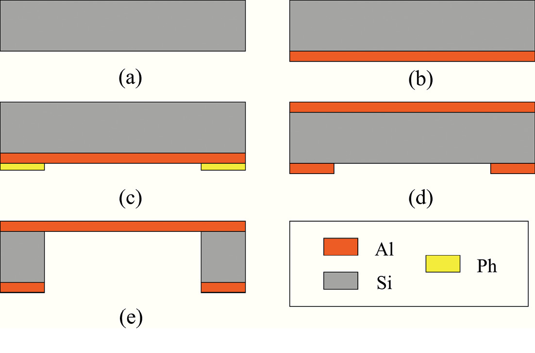 На исходной кремниевой пластине (рис. 1,a). магнетронным методом формируют слой Al на обратной стороне подложки (рис. 1,b), выполняющий функцию защиты поверхности кремния при тралении. Затем проводят фотолитографию по обратной стороне пластины с алюминием (рис. 1,c). После этого проводят жидкостное химическое травление алюминия (рис. 1,d). Затем удаляют резист в ДМФА и осаждают слой Al на лицевой стороне. Далее выполняют глубокое травление кремния (Bosch-процесс) на глубину подложки до Al (рис. 1,e). Под мембраной подразумевается область пленки алюминия на лицевой стороне подложки, не имеющая под собой кремниевой подложки.