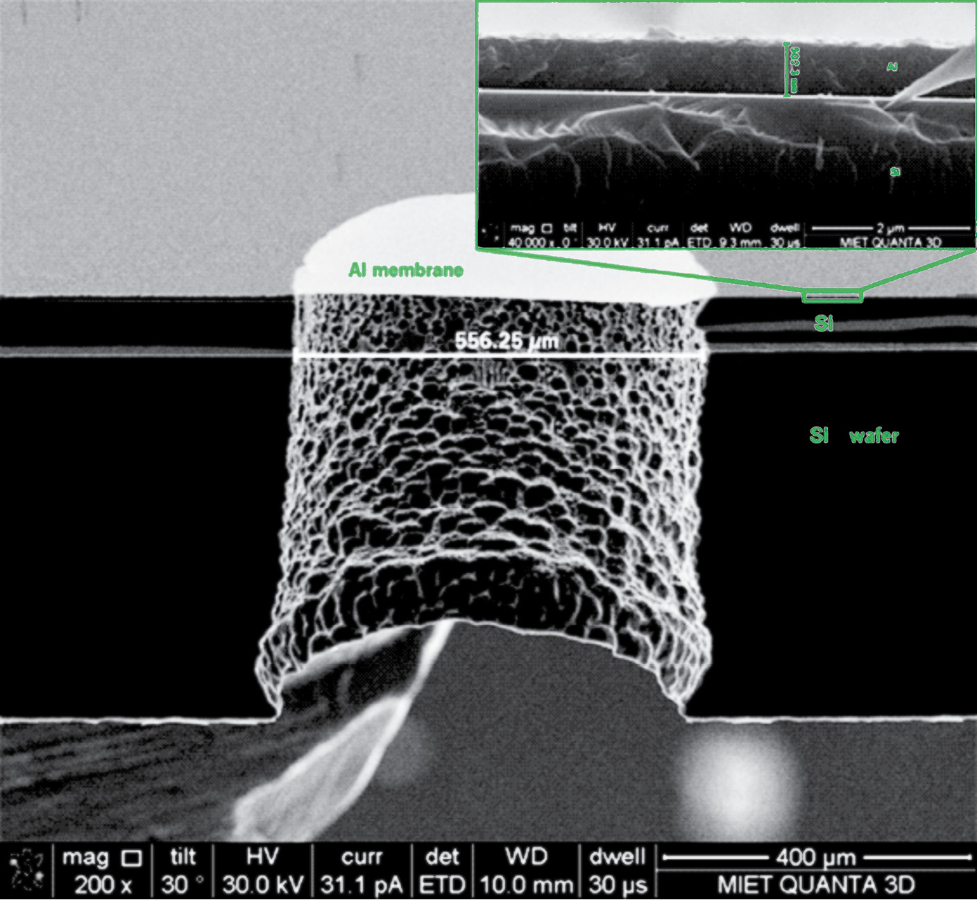 Экспериментальный диаметр мембраны, сформированный после травления Si подложки составляет 556 микрон. Толщина пленки монослоя алюминия составляет 502±10 нм, что обеспечивает пропускание менее 1% при длине волны 13.5 нм [4].