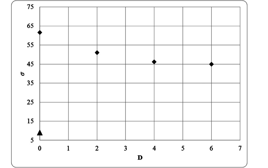 Рис. 4. Зависимость механической прочности от дозы облучения, где треугольником обозначены литературные данные, а ромбиками – данные, полученные в ходе проведения экспериментов для данной работы. По оси х – D – доза облучения, измеряемая в Мрад, по оси у – σ – механическая прочность, измеряемая в ГПа