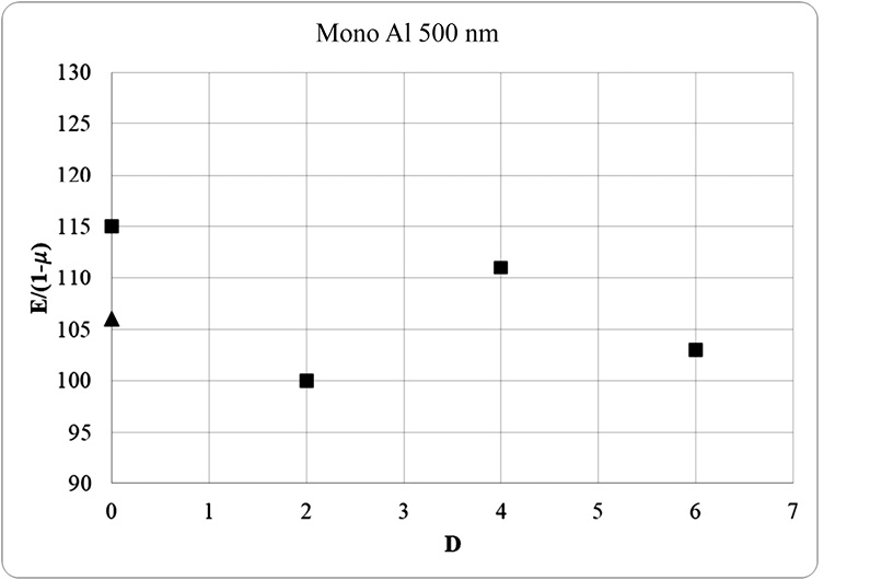 На рис. 5 показаны результаты расчета двухосного модуля упругости по формуле (2.3). Согласно литературным данным двухосный модуль упругости составляет 106 ГПа при коэффициенте Пуассона тонкопленочного материала алюминия составляет 0.34 и модуле Юнга 70 ГПа [7].