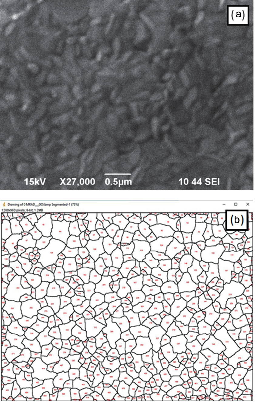 Рис. 6. Анализ размера зерен: a) – фотография с РЭМ; (b) – результат анализа для дозы 0 Мрад
