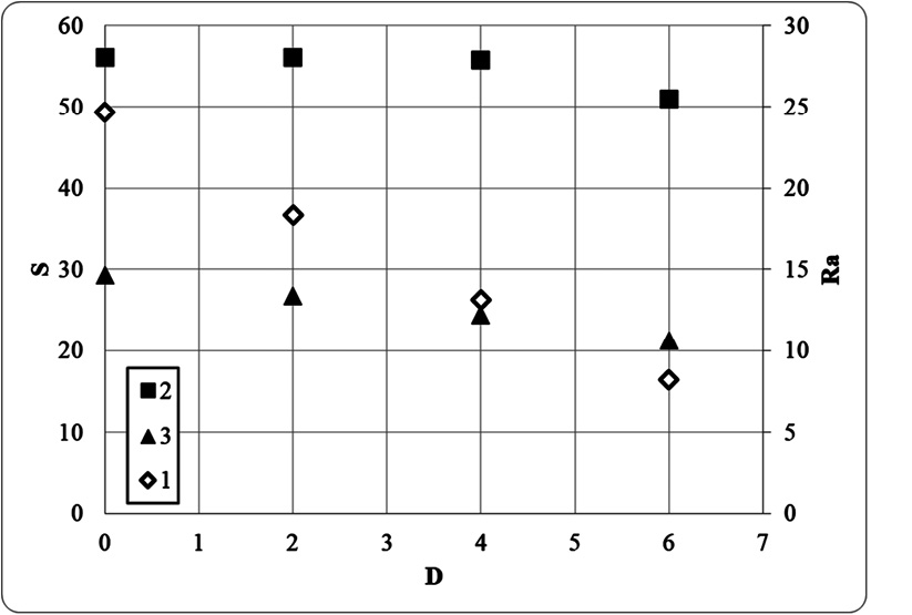 Рис. 7. Зависимость размера зерен и шероховатости от дозы облучения. По оси х – D – доза облучения, измеряемая в Мрад, по основной оси у – S – размер зерен, измеряемый в нанометрах по вспомогательной оси у – Ra – шероховатость поверхности, измеряемая в нанометрах