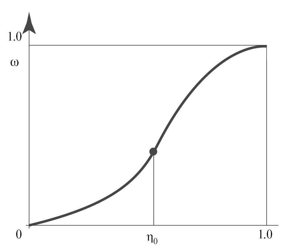 Введение параметра повреждаемости ω позволяет ограничить на величину параметра порядка η ∈ (0,1). Связь процесса эксплуатации сооружения, ассоциируемого с развитием размытого фазового превращения, позволяет схематично представить зависимость ω = ω(η) в форме кривой логистического [6] типа (рис. 1).