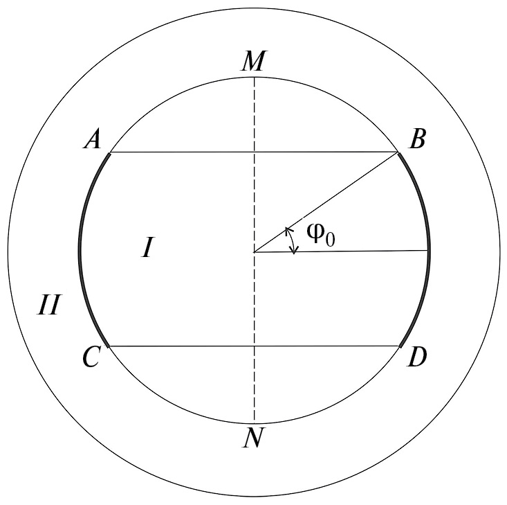 1. Постановка задачи. Исходные зависимости модели. Принимаем, что круглое тонкое кольцо с внешним радиусом r = R1 и внутренним r = R2 насаживается на тонкую пластину (рис. 1), две кромки которой AB и CD прямолинейны, а две другие являются дугами окружности радиуса r = R3. Таким образом сегменты АМВ и СND (рис. 1) материалом не заполнены. Пластинку АВDC считаем металлической с известными термомеханическими свойствами и называем далее охватываемой деталью сборки (I – рис. 1). Кольцо (II – рис. 1) также считаем изготовленным из металла, отличного от металла охватываемой детали I, и называем охватывающей деталью сборки. Последняя нагревается до некоторой достаточно высокой однородной температуры , после чего в неё помещается охватываемая деталь I. Начало процесса посадки связываем с совпадением размеров R2 = R3 = R. При должном назначении R2 и R3 данное совпадение происходит достаточно быстро.