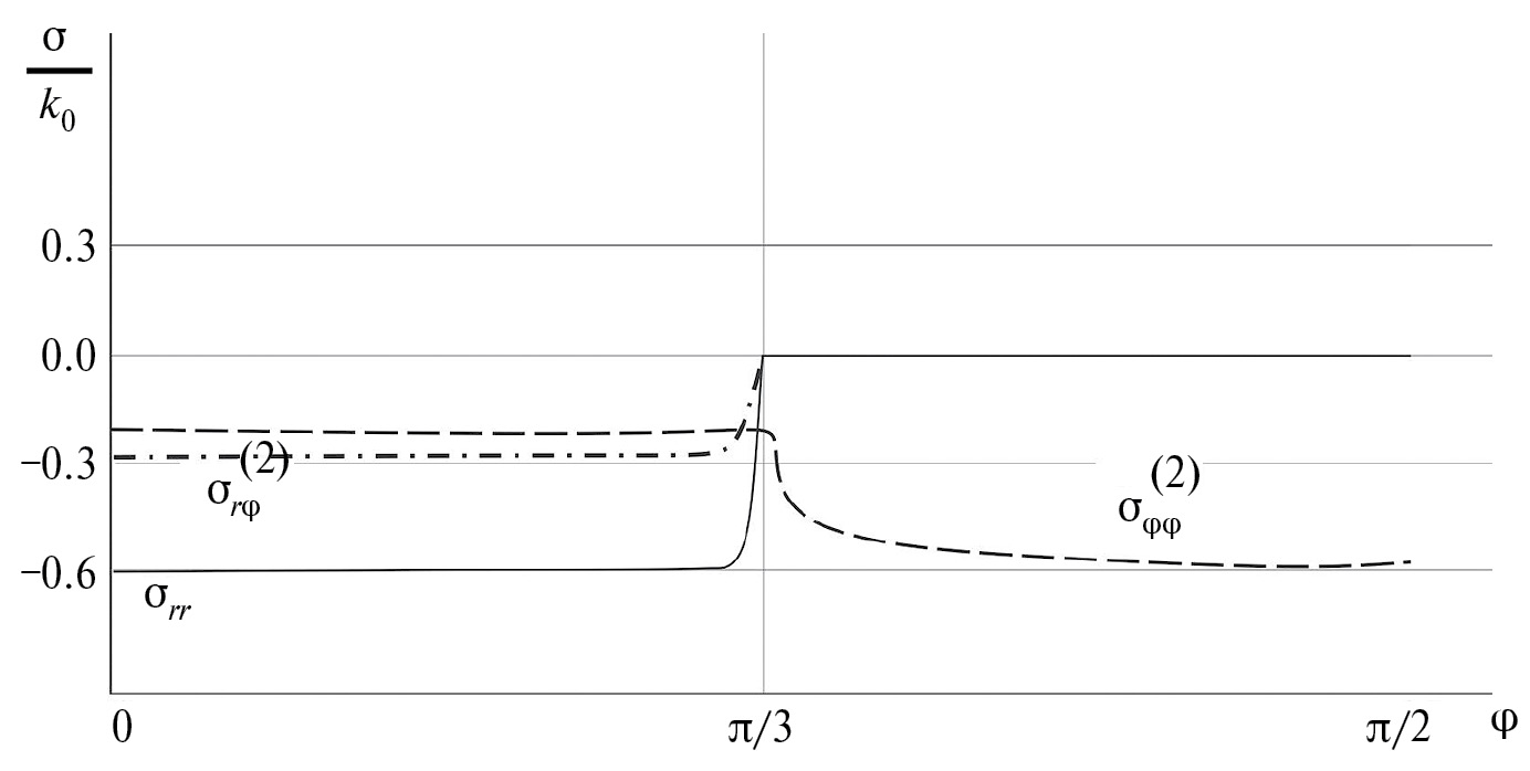 Характерное распределение (рис. 3) остаточных напряжений по поверхности охватывающего кольца r = R, включающей в себя как поверхность константа Ф2, так и свободную поверхность Ф1, показано на рис. 3. При получении графических зависимостей принималось, что охватывающее кольцо изготовлено из латуни , а охватываемая пластинка из бронзы (k0 = 290 МПа, = 58.26 ГПа, = 38.84 ГПа, a = 36 · 10-6 м2/с, Tp = 937 °C, T0 = 20 °C, a = 19.1 · 10-6 (1/°C)). Геометрические размеры деталей сборки задавались значениями: R = 0.04 м, R1 = 0.05 м, = /3.