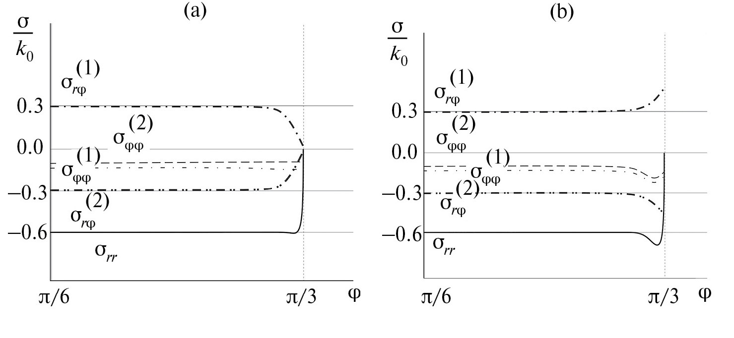 Для исключения сингулярности в заданных граничных условиях используется искусственный прием сглаживания в разрывах значений задаваемых напряжений на граничных поверхностях сопрягаемых деталей. Показывается, что иначе следуют ошибочные результаты (сравнение 4,а,b). Именно подобные ошибки неоднократно встречаются [30–32] в результате расчетов температурных напряжений в собираемых конструкциях. Современная механика деформирования твердых тел располагает [33–37] набором средств для избежание ошибочного влияния сингулярности в задаваемых граничных условиях на следуемые результаты расчетов. Некоторые такие предложения [33, 34] обладают признаками универсальности. Принятый здесь искусственный способ этого лишен. Он только преследует цель показать, что исключение сингулярности в граничных условиях бывает совешенно необходимо. На разработанном примере это удалось продемонстрировать.