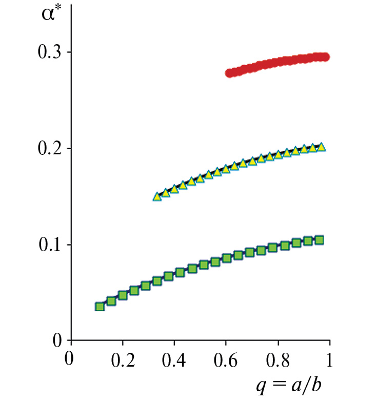 Рис. 7. Эффективный коэффициент * [мкВ-1] пьезоэлектрического расширения композита при a0= 0.1 (○), 0.05 (), 0.01 () [мм].
