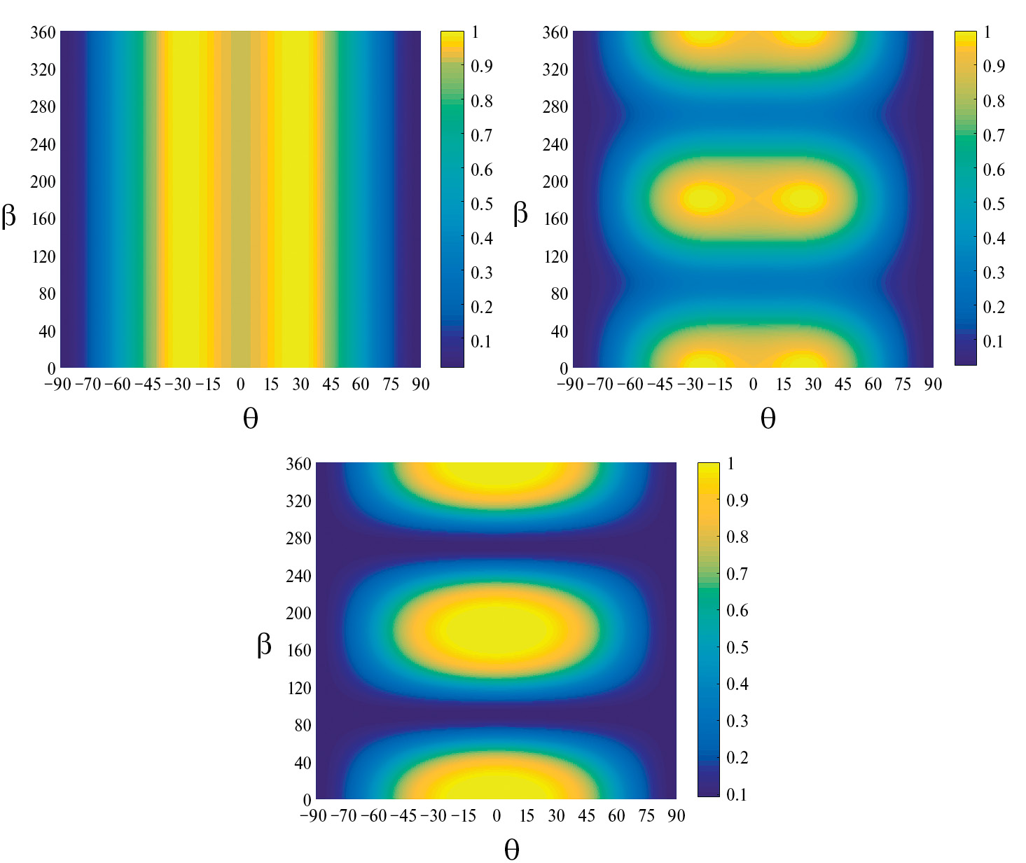 На рис. 3 представлены зависимости функционала от углов ориентации зоны локализованной поврежденности , при = 0.1 для различных значений параметра k. Приведенные зависимости нормированы на свое максимальное значение, так как нас интересует положение локальных максимумов на плоскости , а не их абсолютная величина.