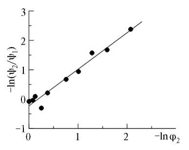 Рис. 2. Экспериментальная зависимость отношения ψ2/ψ1 от объемной доли полимера φ2 для эластомера ПБУ-1, содержащего ДБС, представленная в логарифмических координатах.