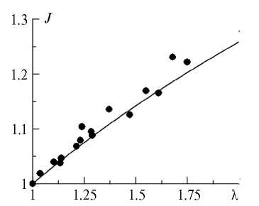 Для независимой проверки адекватности модели была проведена серия экспериментов по определению деформационной зависимости равновесной упругой реакции и степени набухания полимера в условиях одноосного растяжения в среде растворителя. Это сделано для эластомера ПБУ-4 и ДБС в качестве растворителя. Эксперимент состоял в следующем. Образцы эластомера помещались в растворитель и доводились до равновесно набухшего состояния. Затем, после взвешивания, каждый образец подвергался фиксированному одноосному растяжению в растворителе. Поскольку растяжение образца нарушает термодинамическое равновесие в системе “полимер–жидкость”, образец начинает поглощать растворитель, что вызывает релаксацию упругой реакции. Процесс поглощения растворителя прекращается после достижения полимером нового термодинамического равновесия. Об этом свидетельствовало отсутствие изменения упругой реакции образца. После достижения равновесия упругая реакция образца фиксировалась, образец взвешивался, и определялось равновесное значение J, характеризующее равновесную объемную деформацию образца, вызванную дополнительным поглощением жидкости. Такая процедура осуществлялась для каждого образца. При этом для каждого образца назначалось свое значение . Продолжительность эксперимента для одного образца составила 2 суток. Полученные результаты представлены на рис. 3 и 4. Из них видно, что экспериментальные точки хорошо согласуются с теоретическими кривыми, которые рассчитывались с помощью уравнений (5.6)–(5.9).