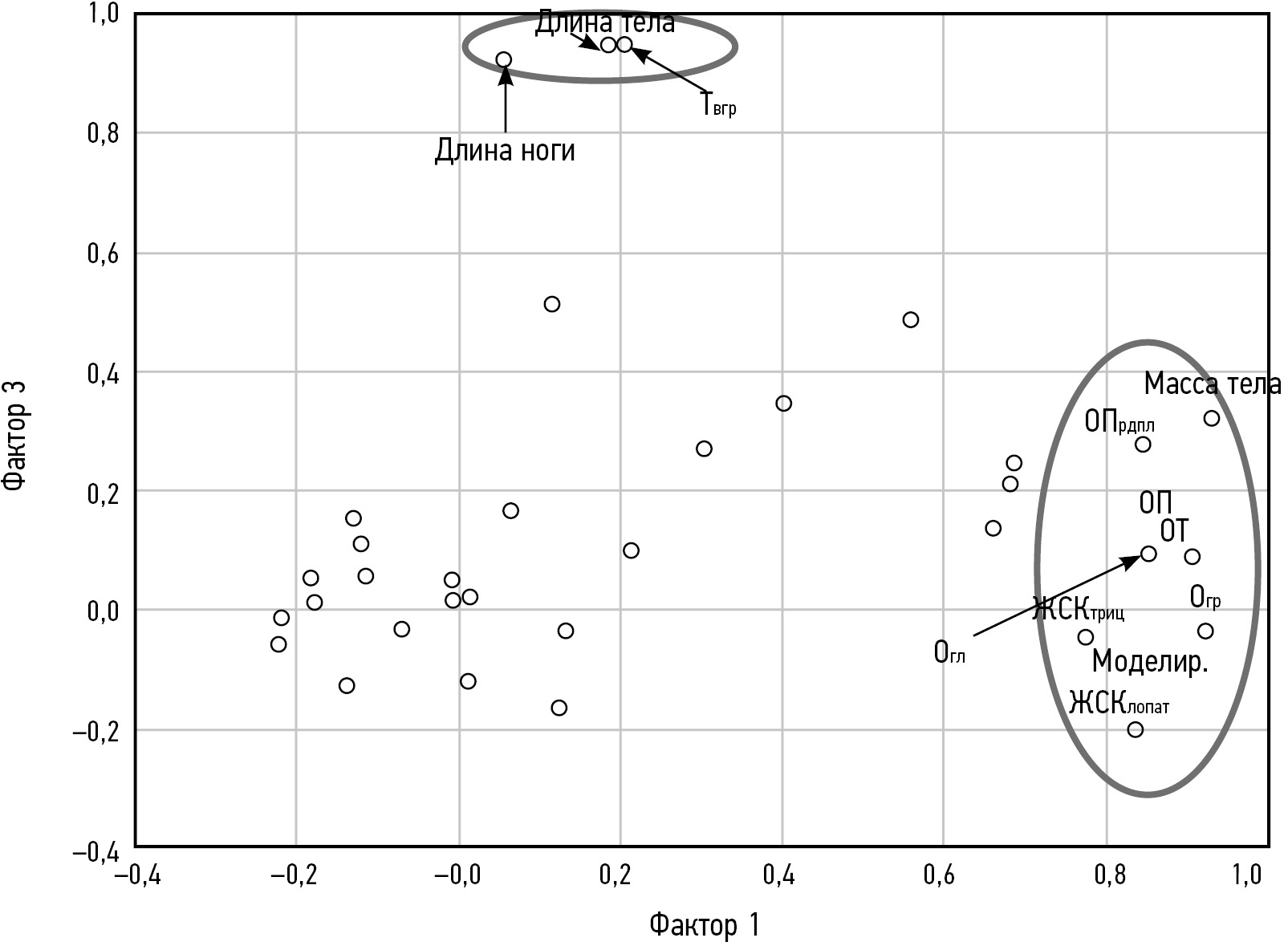 Рис. 1. Распределение факторных нагрузок на размеры скелетные, а также описывающие поперечное развитие тела, в пространстве факторов 1 и 3: Твгр — верхнегрудинная точка; ОП — обхват плеча; ОПрдпл — обхват предплечья; ОТ — обхват талии; Огр — обхват груди; Огл — обхват голени; ЖСКтриц — жировые складки трицепса; ЖСКлопат — жировые складки лопатки.
