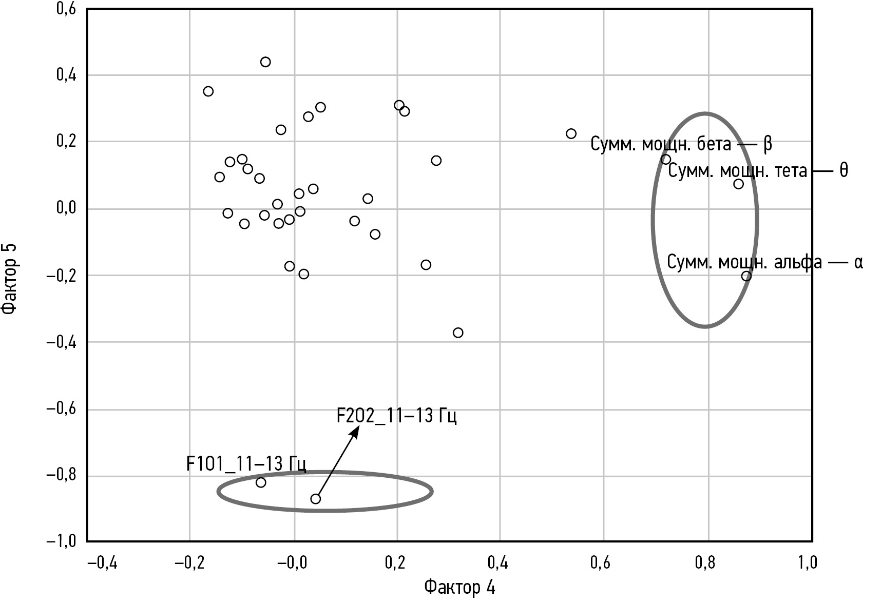 Рис. 2. Распределение факторных нагрузок на показатели мощности и внутриполушарной когерентности ЭЭГ в пространстве факторов 4 и 5: суммарные мощности: α — альфа-ритма, θ — тета-ритма, β — бета-ритма; в области головы (поддиапазон, Гц): F1–O1 (11–13), F2–O2 (11–13).