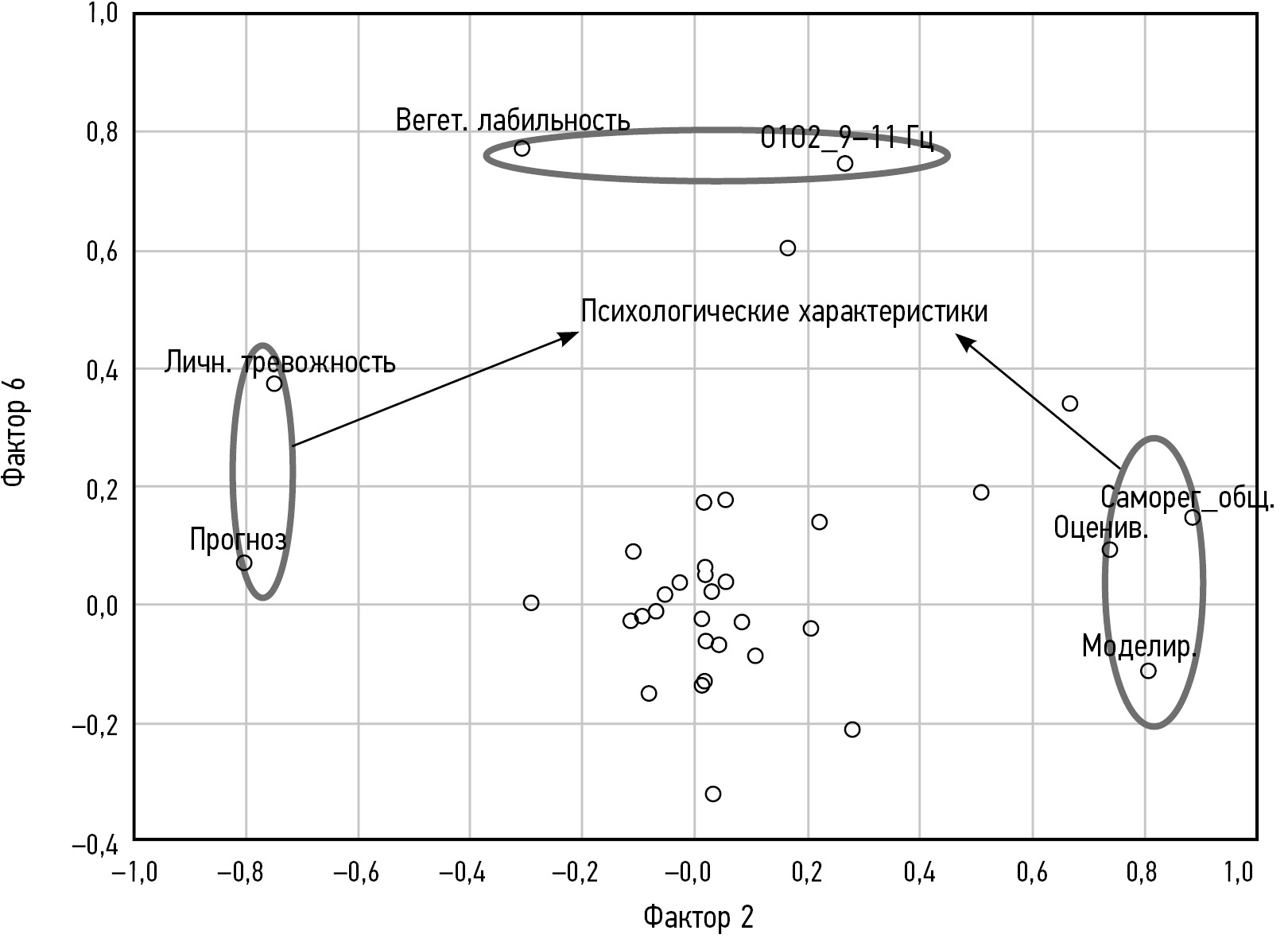 Рис. 3. Распределение факторных нагрузок на психологические характеристики и совместную изменчивость межполушарной когерентности, на свойства вегетативной лабильности в пространстве факторов 2 и 6.