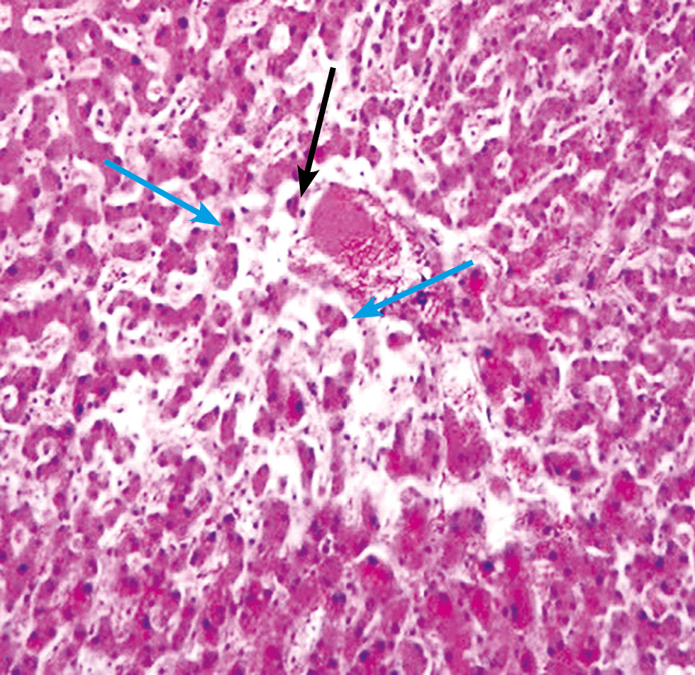 Рис. 1. Группа 2: микроскопическая картина полнокровия центральной вены (чёрная стрелка), расширенных отёчных синусоидов (синие стрелки). Окраска гематоксилином–эозином, ×400.
