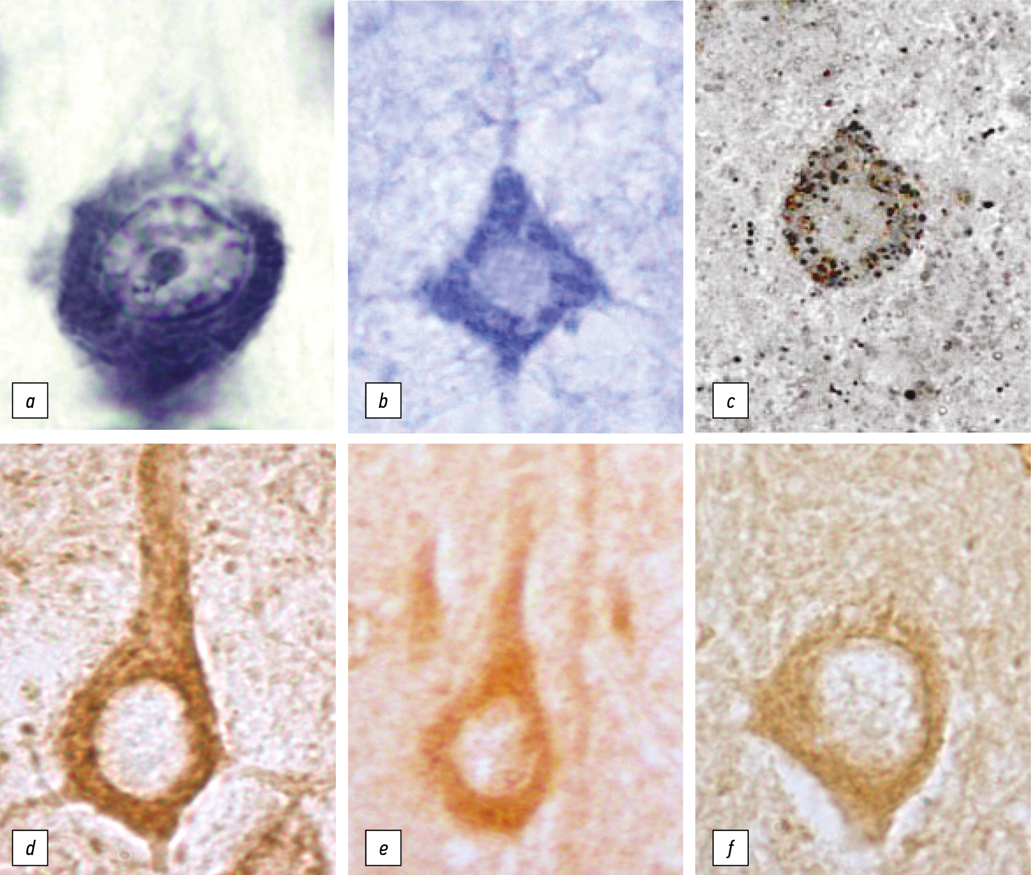 В качестве положительного контроля для каждого из маркёров применяют ткани с известным высоким содержанием исследуемого белка. В качестве отрицательного контроля используют срезы, которые вместо первичных антител обрабатывают нормальной сывороткой (при этом срезы не должны окрашиваться). Дополнительным внутренним отрицательным контролем служат мозговые оболочки (окраска в них должна отсутствовать). Проиллюстрируем этот подход несколькими примерами из своего опыта (см. рис. 2 d, e, f).