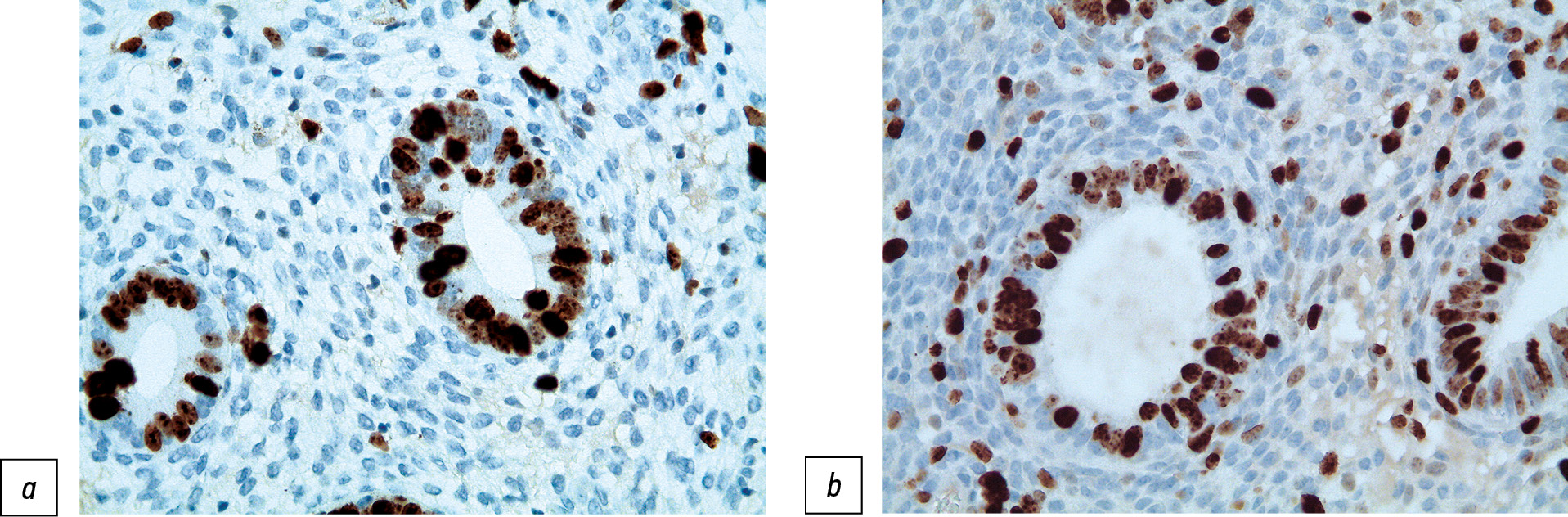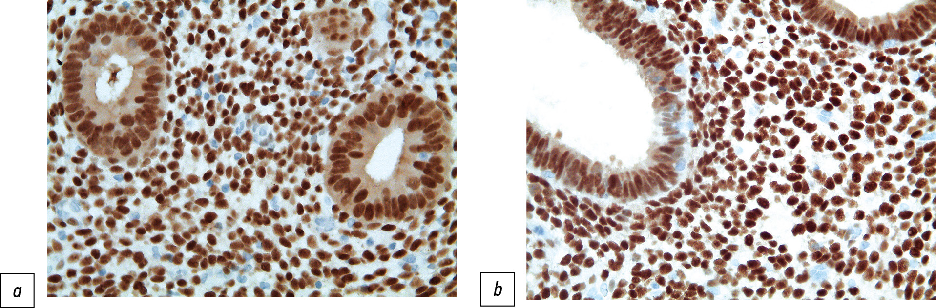 Рис. 2. Иммуногистохимическая экспрессия ERα в ткани гиперплазии эндометрия без атипии исходно в группе с эффективной терапией (а), неэффективной терапией (b) (ИГХ, ×400).