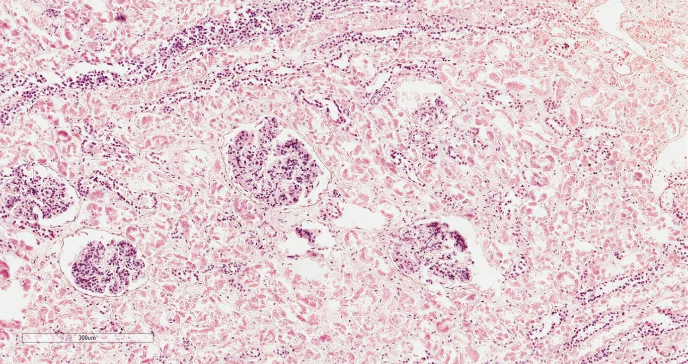 Основными морфологическими проявлениями некротического нефроза ишемического характера являются истончение или упрощение канальцевого эпителия с потерей щёточной каймы и вздутием апикальной цитоплазмы с усилением эозинофильного окрашивания. Ядра нефроцитов характеризуются конденсацией хроматина, усилением базофильного окрашивания или потерей чёткого контура ядра. Просветы канальцев заполнены отслоившимися некротическими эпителиальными клетками канальцев, остатками фибрина или гиалиновыми цилиндрами (рис. 2).