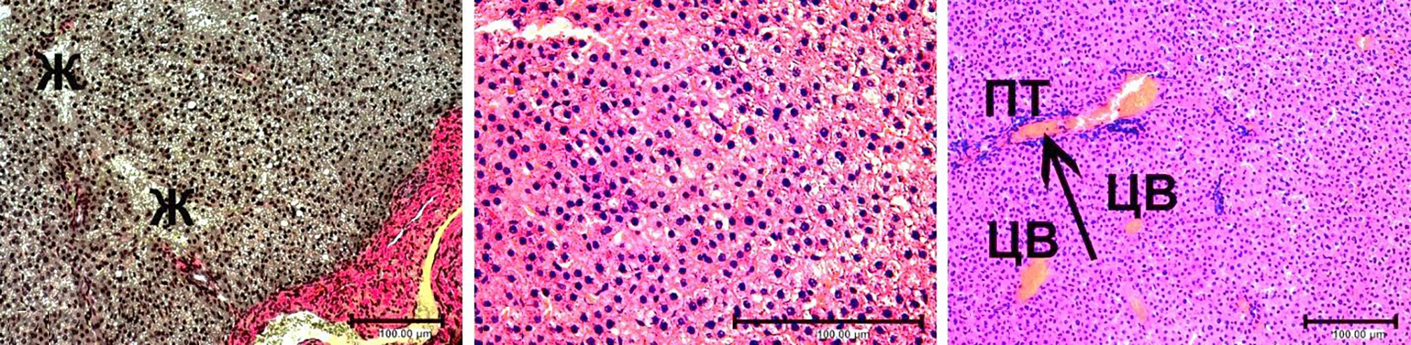 Fig. 2. The structure of the rat liver of the 1st experimental group: a — vacuolization of hepatocytes, loss of the trabecular structure of the parenchyma; coloring according to Van Gieson; ×100; b — dystrophic changes in hepatocytes, loss of beam architectonics in the parenchyma; stained with hematoxylin and eosin; ×200; c — hemostasis in the central veins and vessels of the portal tracts (↑); stained with hematoxylin and eosin; ×100. Here: ПТ — portal tracts, ЦВ — central veins; Ж — areas with fatty degeneration.