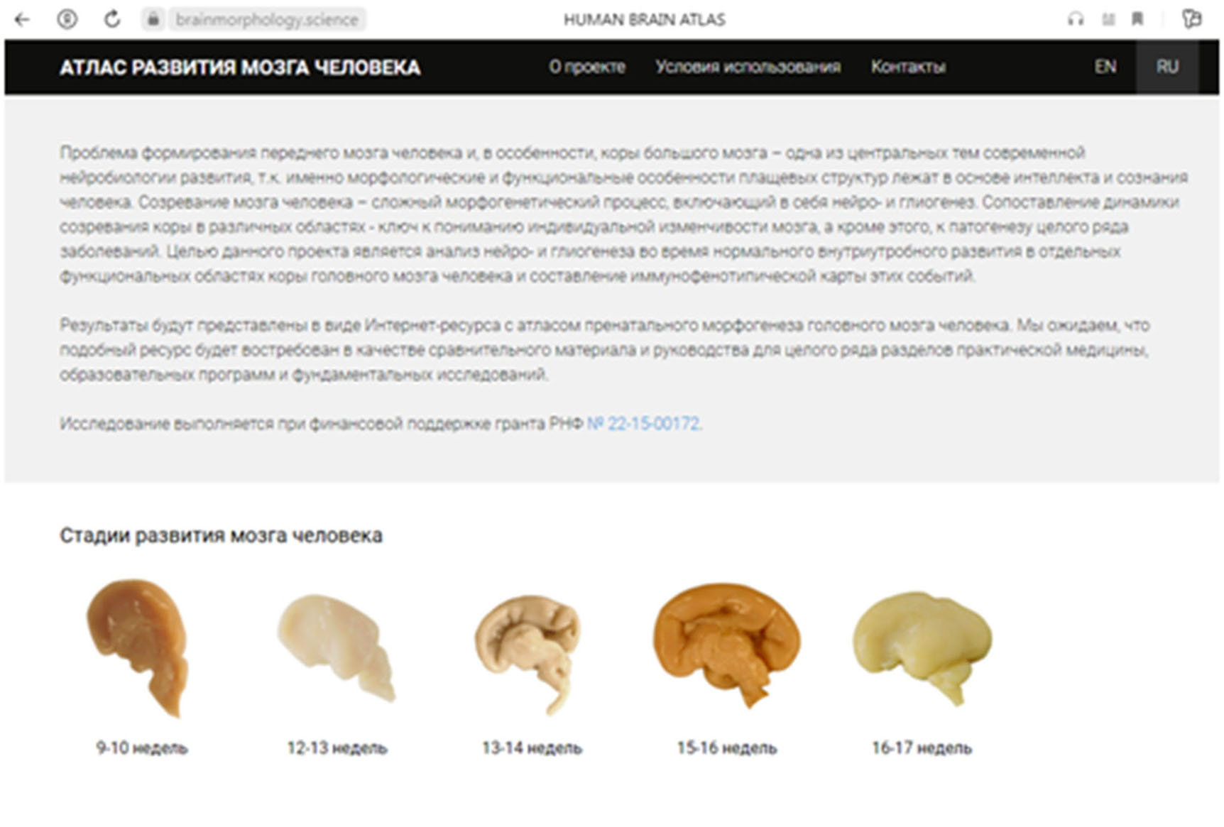 В настоящее время часть материалов уже доступна на сайте проекта https://brainmorphology.science/ru/ На сайте представлены общая информация о проекте; описание основных методов, которые применяются при создании атласа; краткое описание и микрофотографии гистологических серийных срезов головного мозга эмбрионов и плодов на сроках от 10 до 23 нед гестационного развития. Некоторые препараты доступны с более низким разрешением на веб-сайте лаборатории https://brainmicroscopy.com/collection/homo/brain-development/normal-development/normal-stage-20/