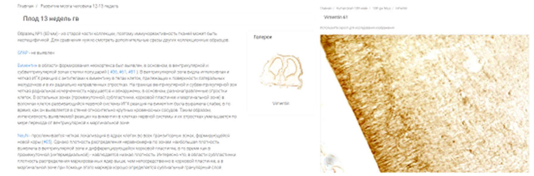 Рис. 4. Модуль «Иммуногистохимические атласы»: a — скриншот страницы с описанием результатов иммуногистохимических реакций на срезах головного мозга с различными маркёрами на определённом сроке развития человека; b — возможность просмотра увеличенного фрагмента среза.