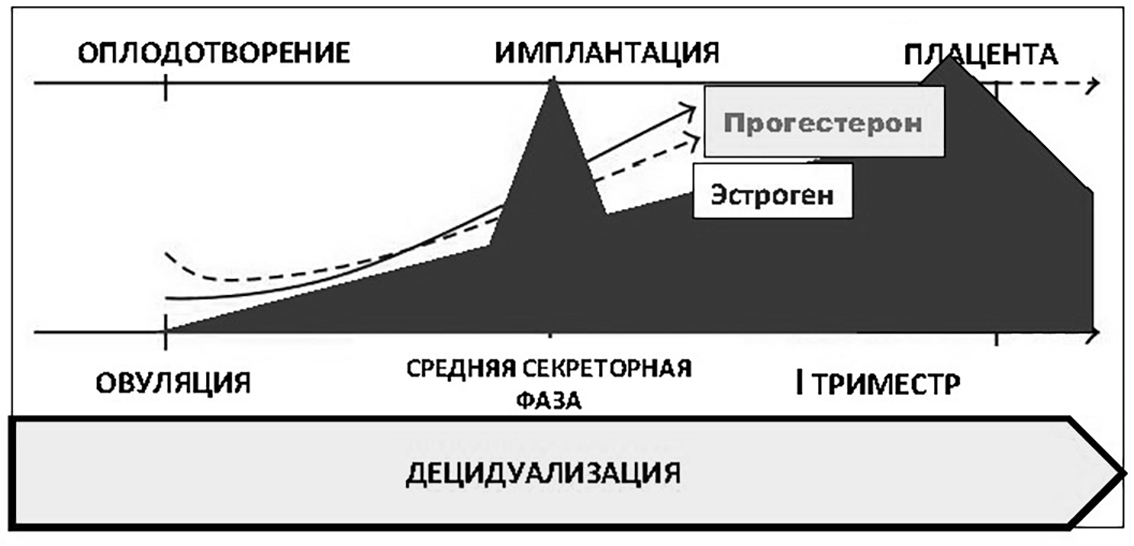 В пролиферативной (фолликулярной) фазе цикла эстрадиол стимулирует транскрипцию рецептора прогестерона в клетках эндометрия, обеспечивая их чувствительность к прогестерону в секреторной фазе [1, 3]. Эстроген-зависимая пролиферация во время фолликулярной фазы контролирует разделение эпителиальных и стромальных клеток эндометрия на субпопуляции с различными функциями после овуляции и ответом на децидуальные стимулы [2, 4, 5]. После овуляции повышение уровня прогестерона провоцирует начало децидуализации, и его высокий уровень поддерживается в течение всей беременности [6]. Прогестерон является важным сигналом децидуализации и предпосылкой успешной имплантации. Динамика интенсивности секреции яичниками эстрадиола и прогестерона в менструальном цикле контролирует децидуализацию и имплантацию [6, 7]. Известно, что постовуляторный дефицит прогестерона связан с бесплодием и повторяющимися выкидышами [8].