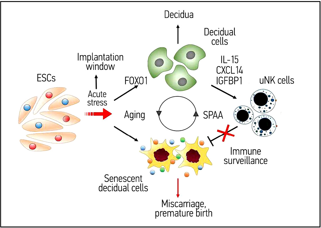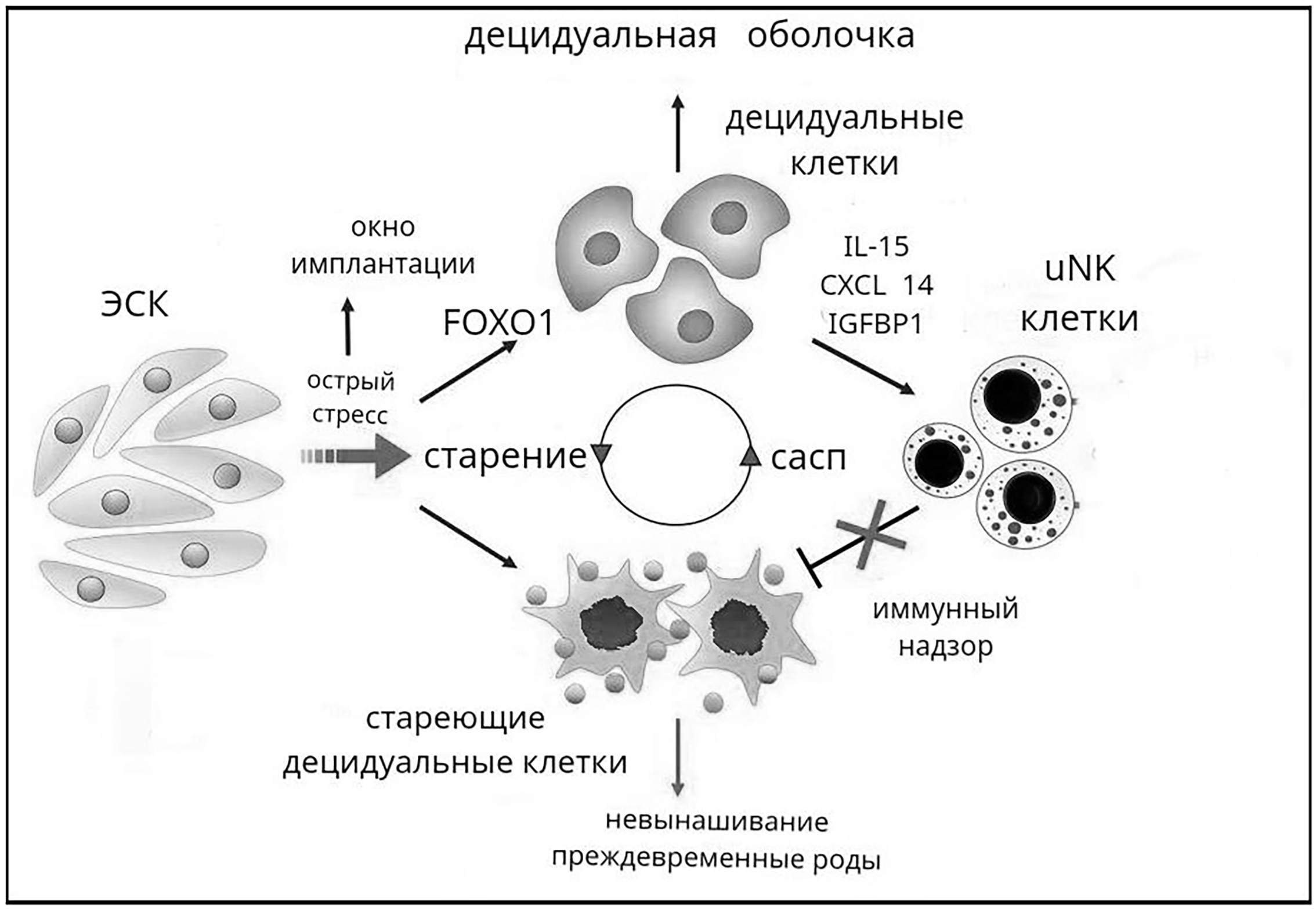 В циклах без зачатия снижение уровня прогестерона приводит к нарушению взаимодействия между дЭСК и uNK, что включает программу дифференцировки по направлению к фенотипам сендЭСК и трансЭСК, участвующим в разрушении и восстановлении тканей. Примечательно, что стареющие клетки также привлекают нейтрофилы и макрофаги, которые при активации и дегрануляции усиливают клеточное старение и разрушают межклеточный матрикс [32, 33]. Нарушение взаимодействия uNK и дЭСК в первом триместре беременности может стать причиной ранних потерь беременности. К концу срока беременности количество стареющих сендЭСК, экспрессирующих провоспалительные факторы, а также обусловливающих деградацию и ремоделирование внеклеточного матрикса, значительно возрастает, что способствует наступлению родов [16].