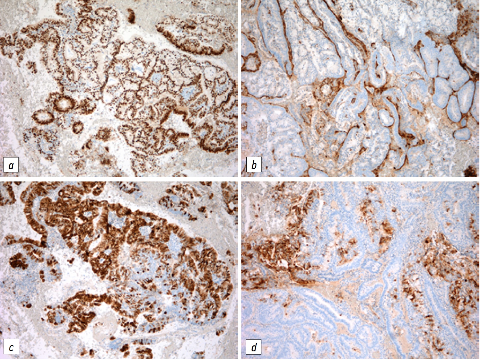 При иммуногистохимическом исследовании в участках типичной эндометриоидной карциномы и в участках микрожелезистоподобного варианта строения наблюдали экспрессию антител к β-катенину, виментину, рецепторам к эстрогенам (рис. 2, a), цитокератинам 8/18, 7, EMA, CD44, стромальную экспрессию CD10 (рис. 2, b). Кроме того, в участках микрожелезистоподобного типа строения обнаружена очаговая экспрессия p16 (рис. 2, c), CK17, p53. Очаговая экспрессия СК5 и CEA (рис. 2, d) выявлена преимущественно в очагах плоскоклеточной дифференцировки. Экспрессия MUC2 отсутствовала.