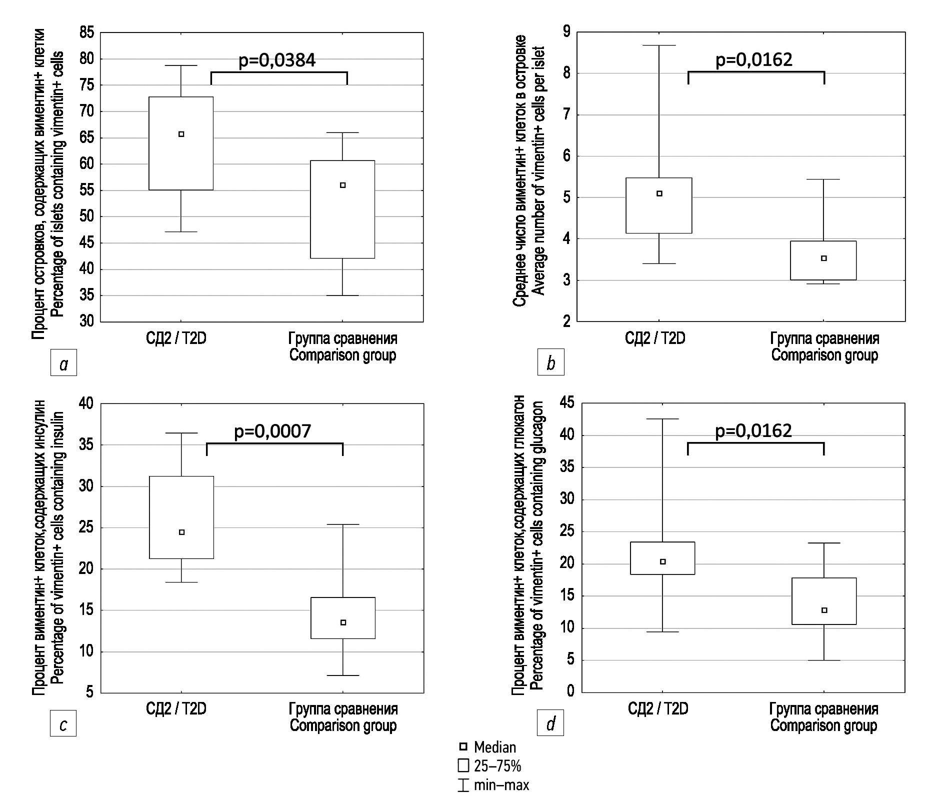 Fig. 2. Distribution of vimentin-positive cells in the pancreatic islets in T2D and comparison group: a — percentage of islets containing vimentin-positive cells; b — average number of vimentin-positive cells per islet; c — percentage of vimentin-positive cells containing insulin; d — percentage of vimentin-positive cells containing glucagon. Significant differences between groups (Mann–Whitney U-test) are marked by square bracket and p-value. T2D — type 2 diabetes
