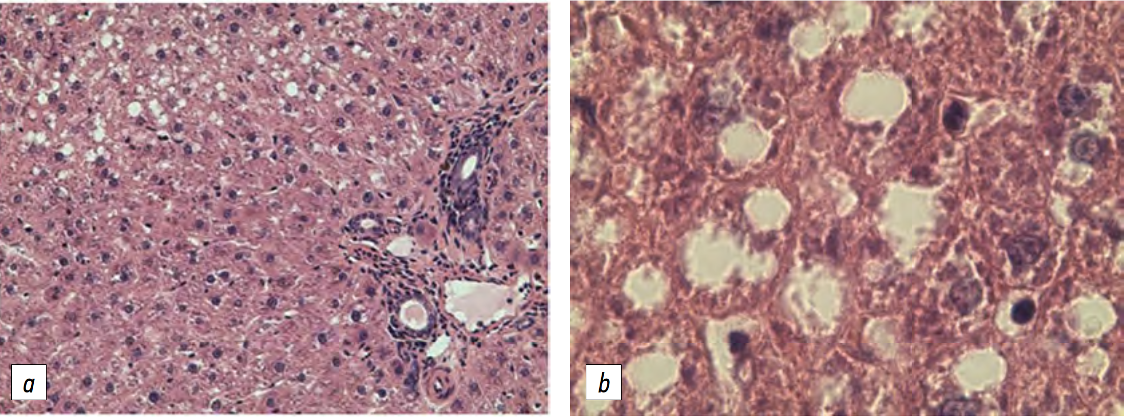Fig. 3. Liver of rats of group 3 (♂, chronic alcohol intoxication): a — hematoxylin and eosin staining, ×200; b — staining with sudan III with additional staining with hematoxylin, ×400 [18].