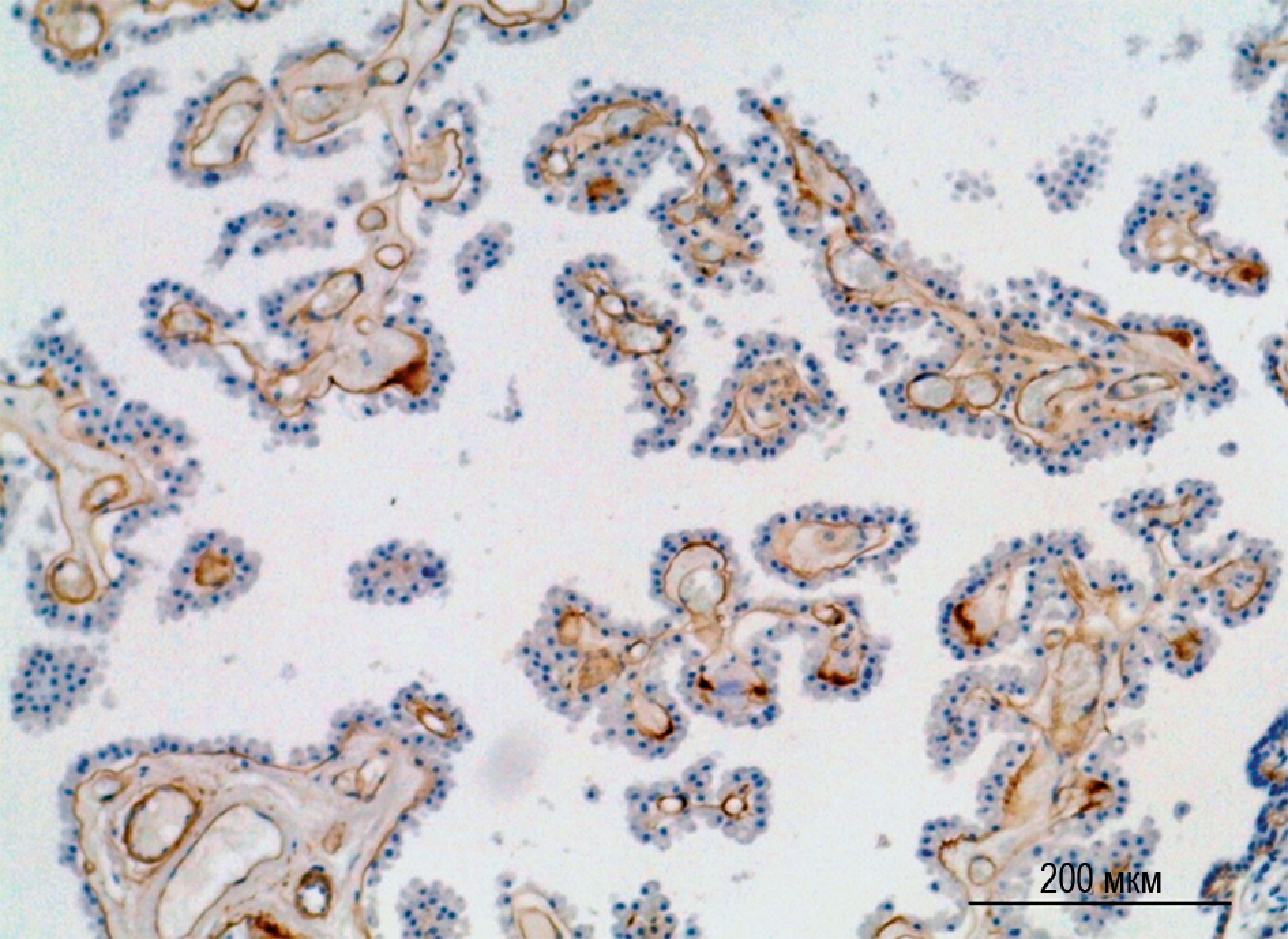 The distribution of this protein in the subepithelial area and the stroma of the villi of the vascular plexus was demonstrated by an immunohistochemical reaction with antibodies against collagen type IV. All immunopositive structures exhibited clear contours, with no reaction from the cellular cytoplasm and no non-specific background. Control specimens demonstrated no reaction (Fig. 1).