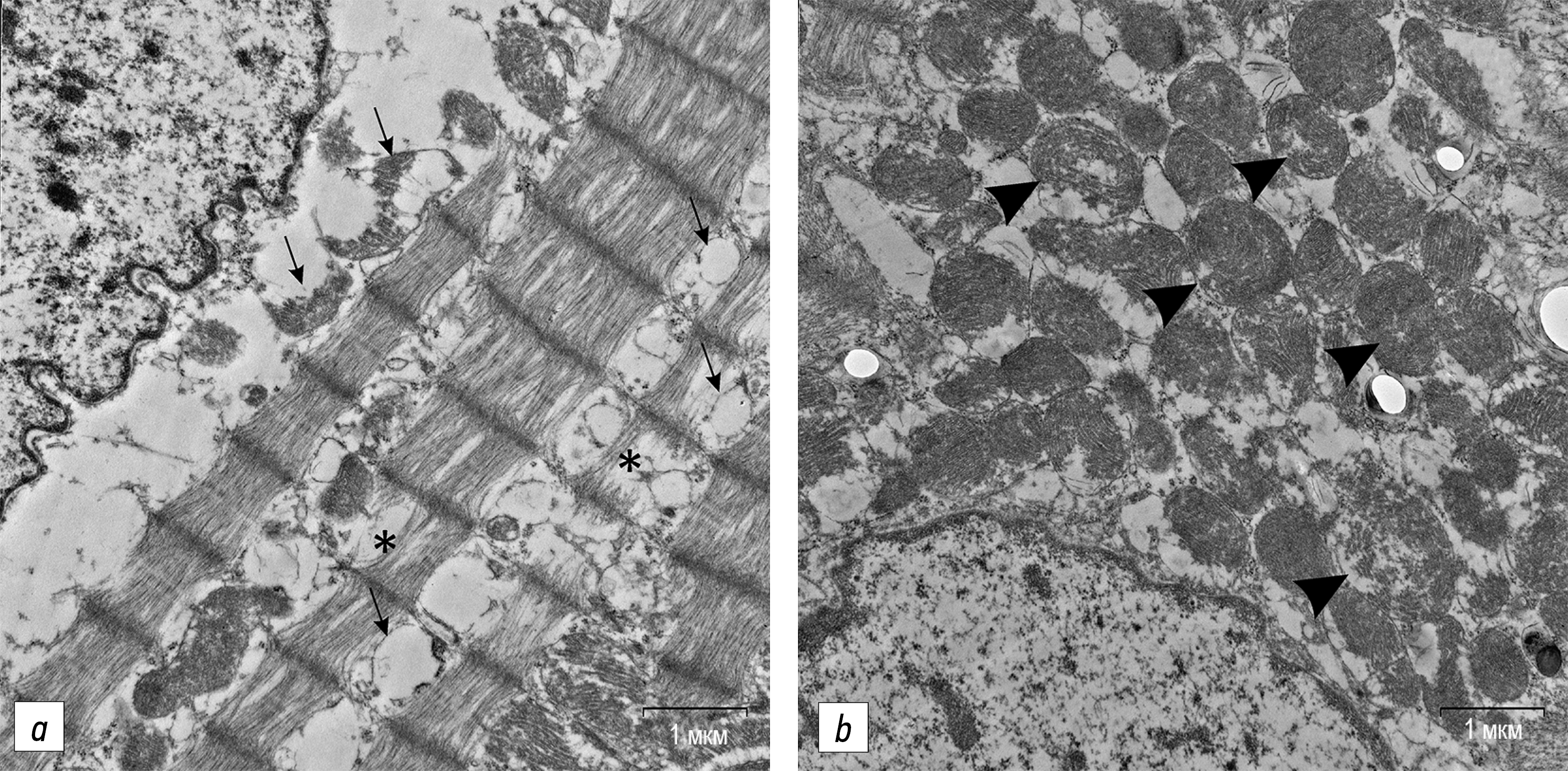 Рис. 2. Фрагмент цитоплазмы кардиомиоцита недоношенных самцов крыс (а, b) на 180-е сутки постнатального онтогенеза. Окрашивание уранил ацетатом и цитратом свинца, ×25 000 (а, b). Повреждение митохондрий обозначено стрелками; головки стрелок указывают на митохондрии с концентрическими кристами. Звёздочками (*) отмечено истончение миофибрилл.