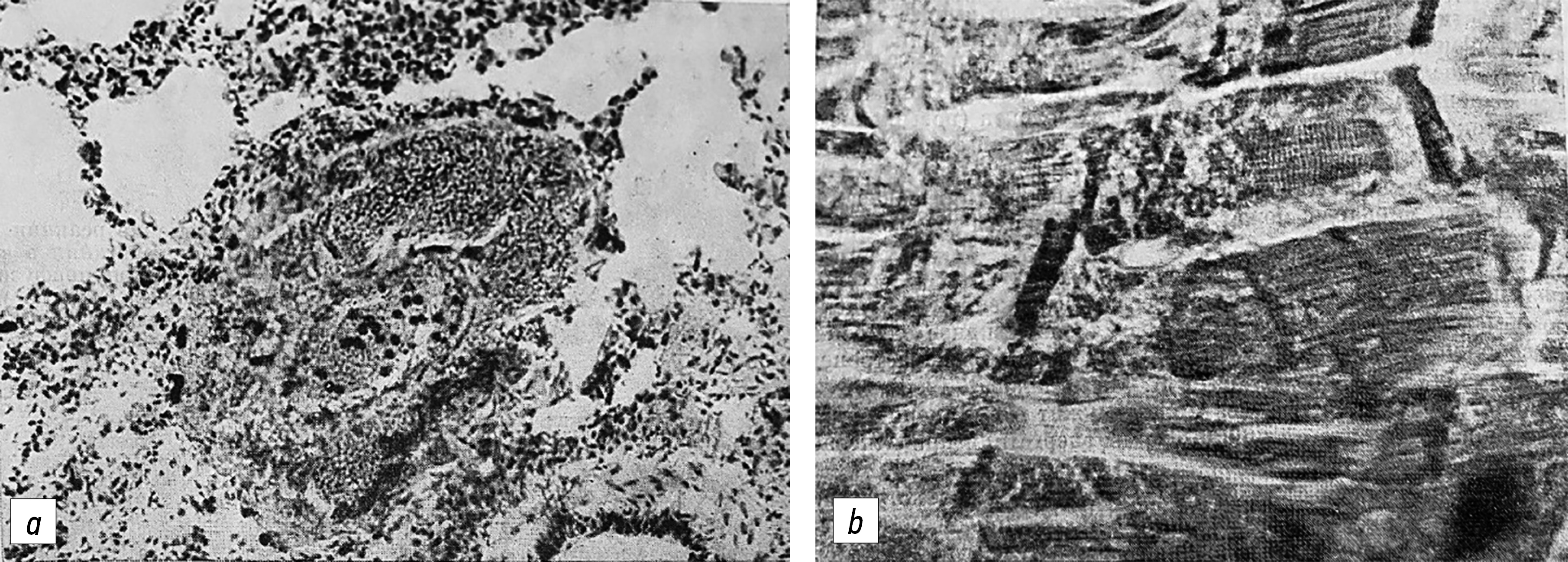 Рис. 4 . Микрофотографии из монографии [6]: a — периваскулярное кровоизлияние в лёгком при перфузии цельной кровью; b — контрактурные изменения пучков кардиомиоцитов.