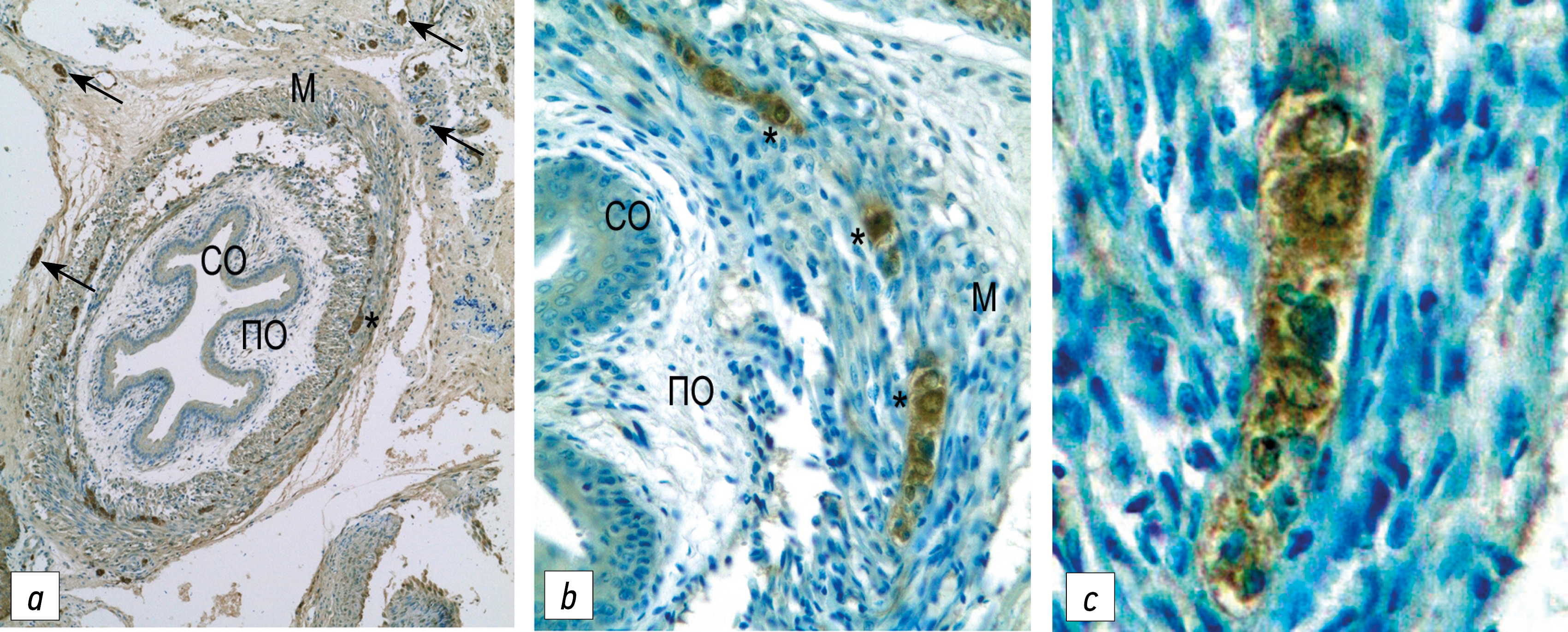 Fig. 3. Nervous structures in the wall of the esophagus of a newborn rat in the mediastinum. MM — mucous membrane, SM — submucosa, M — muscular shell of the esophageal wall; * nerve cells of the Auerbach plexus; ↑↑ — bundles of nerve fibers. Immunohistochemical reaction to PGP protein 9.5; ×40 (а), ×100 (b), ×400 (c).