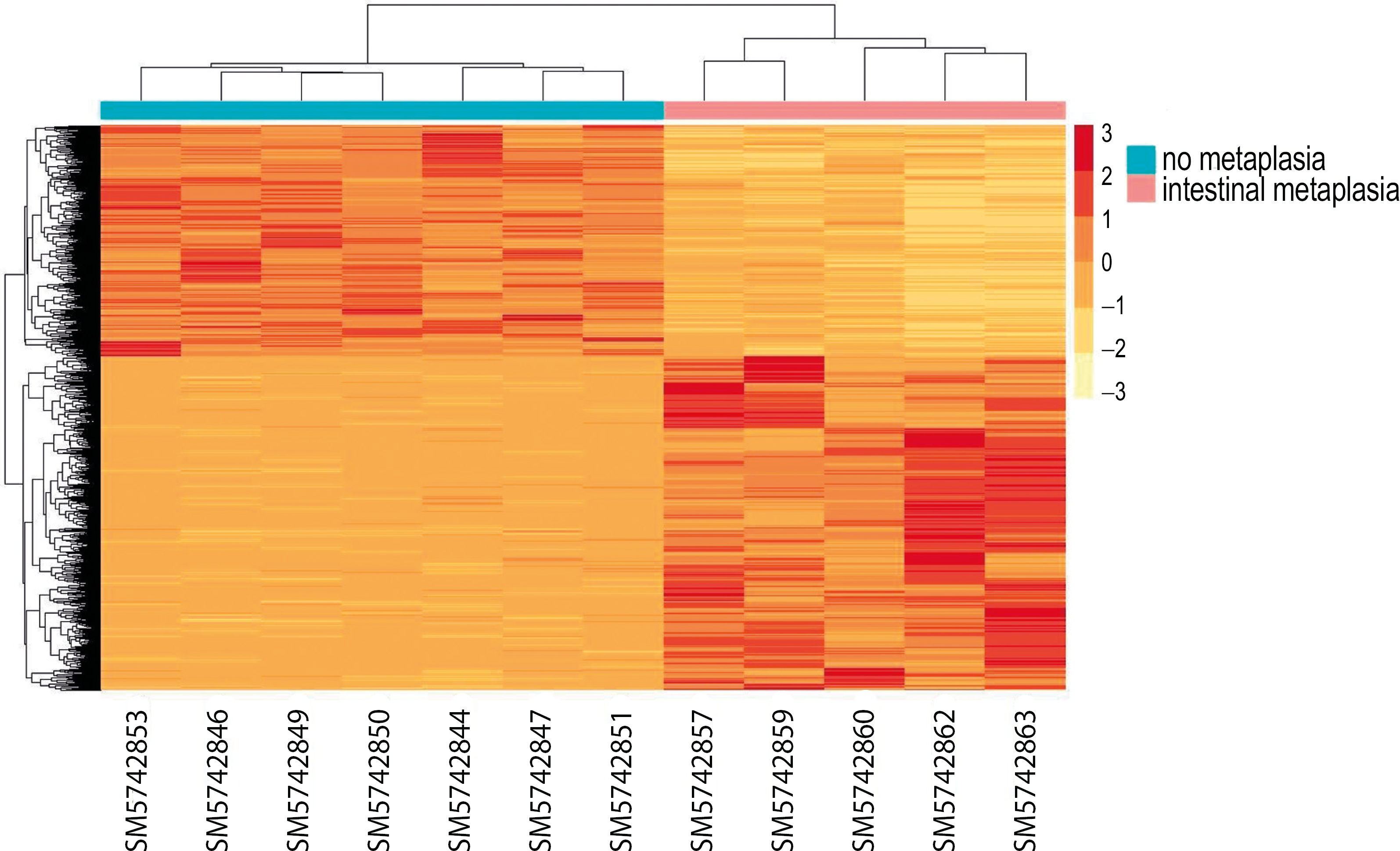 To detect genes which expression changes during the development of gastric mucosal epithelial metaplasia, differential gene expression analysis was performed. The quality of the samples was tested using principal component analysis. Eight transcriptomes were removed due to the presence of intermediate phenotypes. In 12 samples, 3118 genes with an expression change in >1.5 times in the metaplasia group were detected (Appendix 1), including 1843 genes with increased expression and 1275 with decreased expression (Fig. 4). Hierarchical cluster analysis revealed the presence of two patterns of genes, whose expression differs between the groups and allows dividing the samples into two clusters (Fig. 5). The 10 genes with the highest expression are presented in Table 2.
