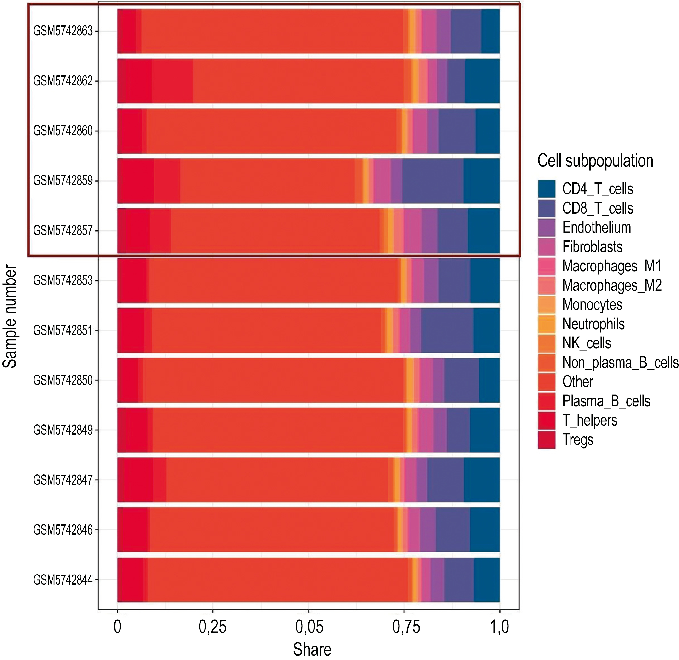 Fig. 7. Deconvolution`s results of RNA-seq data. The first five samples belong to the group of intestinal metaplasia (highlighted with a red frame), the rest — to the group without metaplasia.