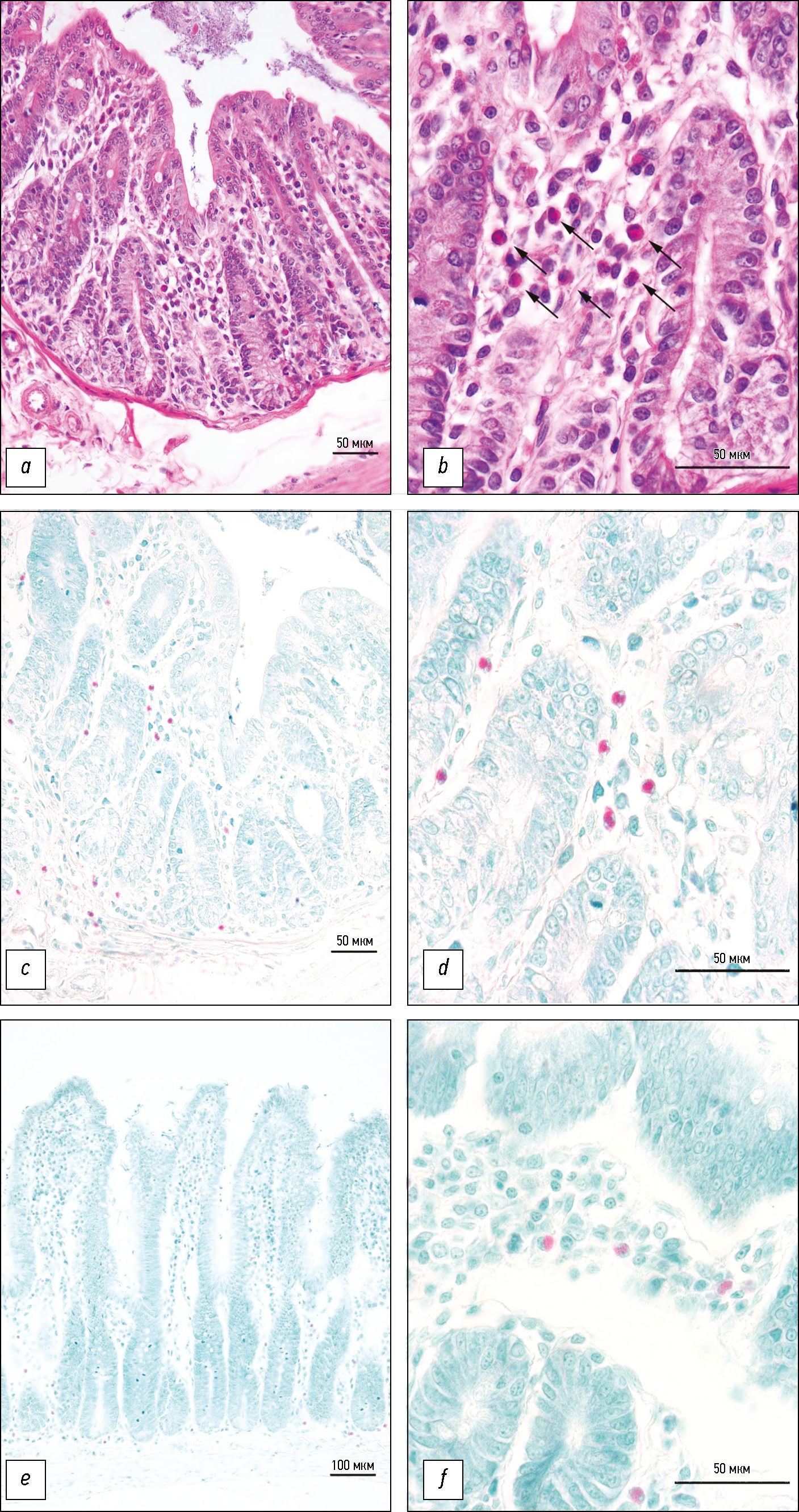 Рис. 1. Микрофотографии гистологических срезов: a–d — толстая кишка крысы; e, f — тонкая кишка крысы. Окраска: a, b — гематоксилином и эозином; c–f — эозином и метиленовым зелёным. Стрелками указаны эозинофилы. Объектив: e — 20х/0,40; a, c — 40х/0,65; b, d, f — 100х/1,25.