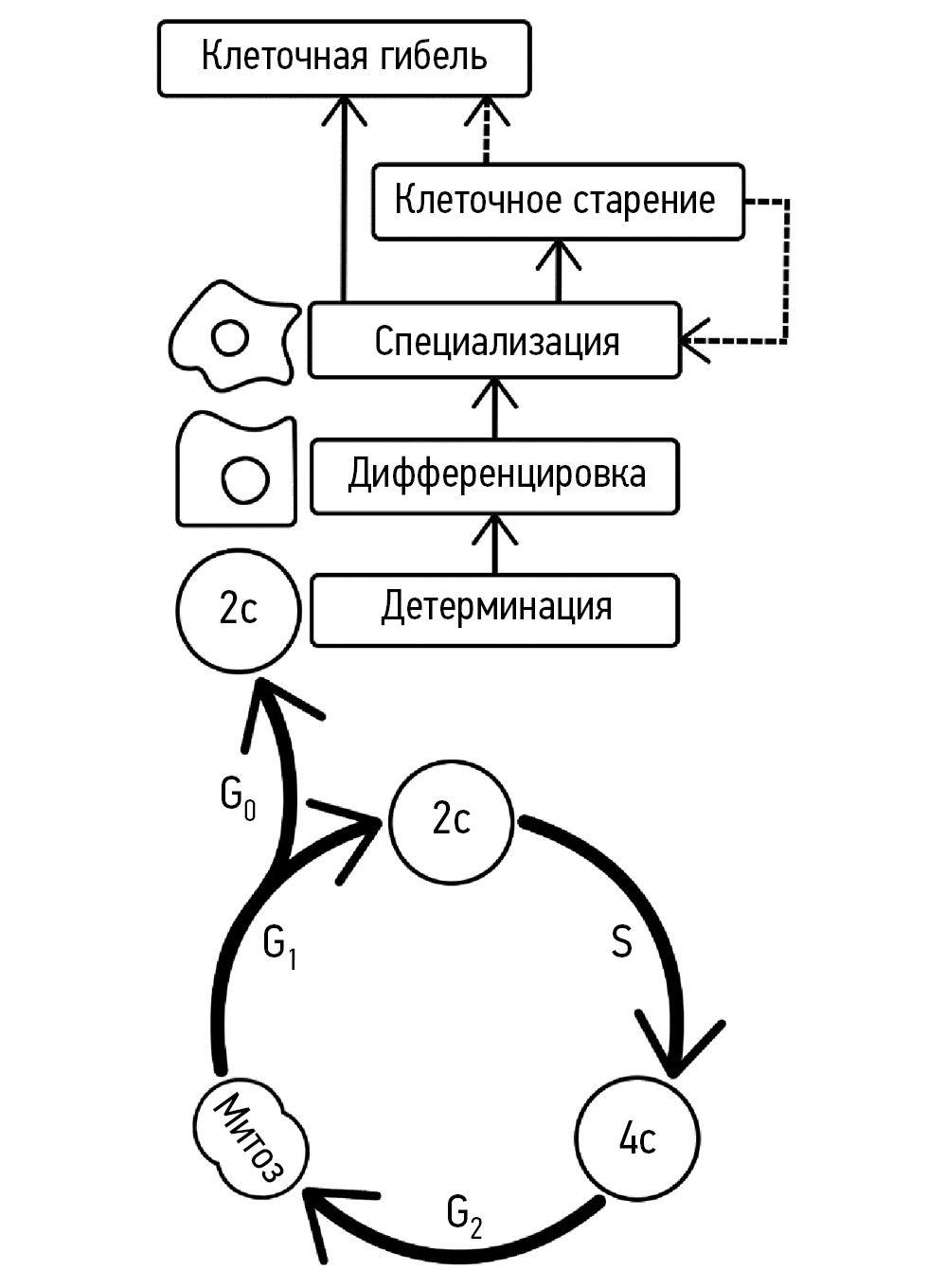 Based on classic works by histologists in the second half of the 20th century, the concept of systemic structural organization of histogenesis was developed as the fundamental core of tissue theory [14]. There are several stages (factors, elementary processes) in the structure of histogenesis, including proliferation, determination, migration, differentiation, specialization, growth, reproduction, integration, and death [15–17]. It seems appropriate to supplement the chain of logical events with the stage of cellular aging. This has already been partially reflected in scientific and educational works on histology [18].