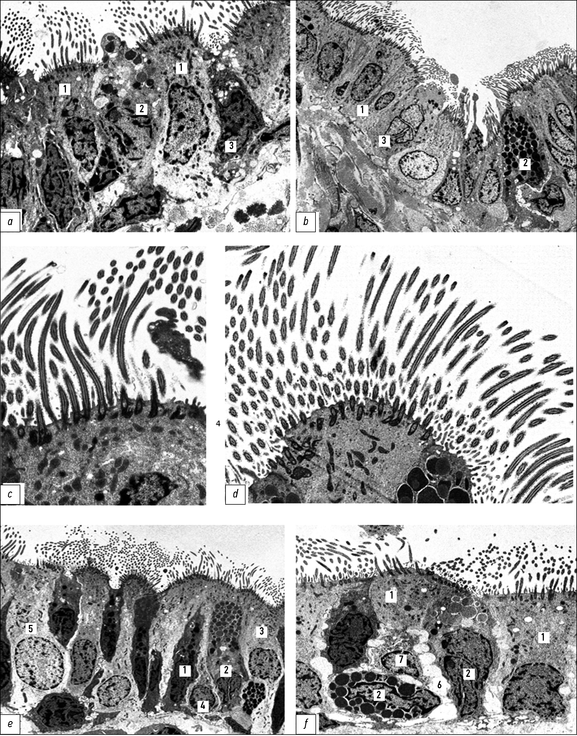 Рис. 2. Эпителиальная выстилка бронхов у крыс: в возрасте 6 месяцев а — главного бронха, b — сегментарного бронха; в возрасте 26 месяцев c — сегментарного бронха, d–f — главных бронхов. 1 — реснитчатые, 2 — бокаловидные, 3 — щёточные (безреснитчатые), 4 — базальные клетки, 5 — гипертрофированная реснитчатая клетка, 6 — участки межклеточного отёка, 7 — эпителиоцит с морфологическими признаками повреждения. Трансмиссионная электронная микроскопия, а, b, e, f — увеличение ×5000, c, d — ×10000.