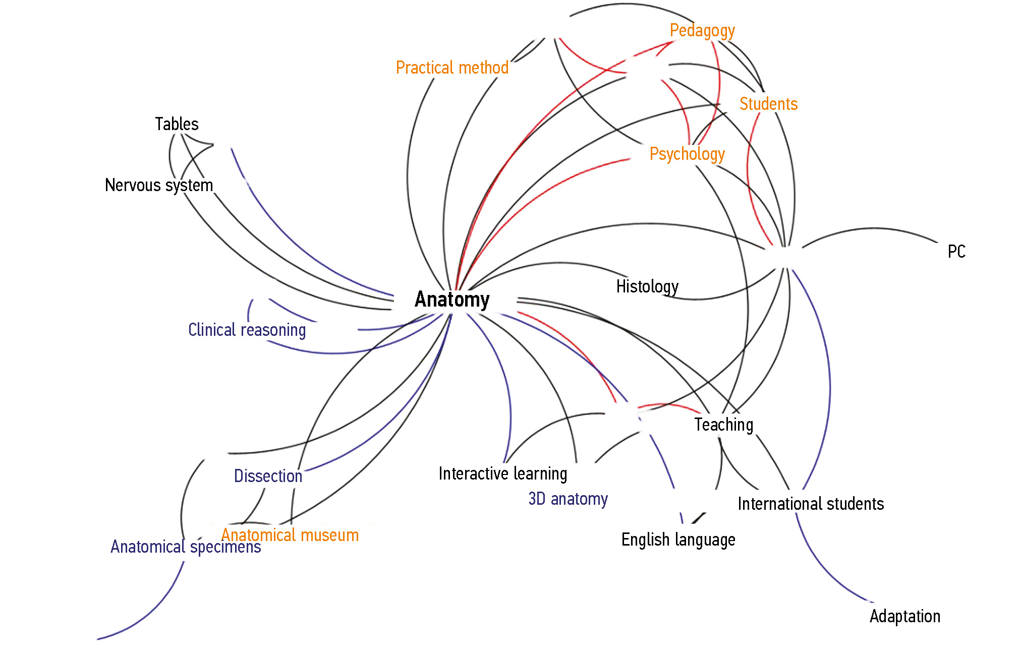 Our findings also indicate a growing frequency of terms such as pedagogy, psychology, and students in publications. Over the past decade, the practice of surveying students to evaluate their satisfaction with the educational process has made it possible to consider learners’ perceptions of faculty competence and the organization of teaching activities. The analysis of various surveys has revealed psychological difficulties associated with the study of human anatomy [12].