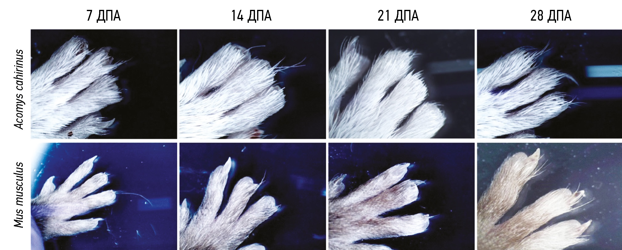 Рис. 1. Дистальный отдел задних конечностей Acomys сahirinus (верхний ряд) и Mus musculus (нижний ряд) через 7, 14, 21 и 28 дней после ампутации (ДПА) 2, 3 и 4 пальцев.